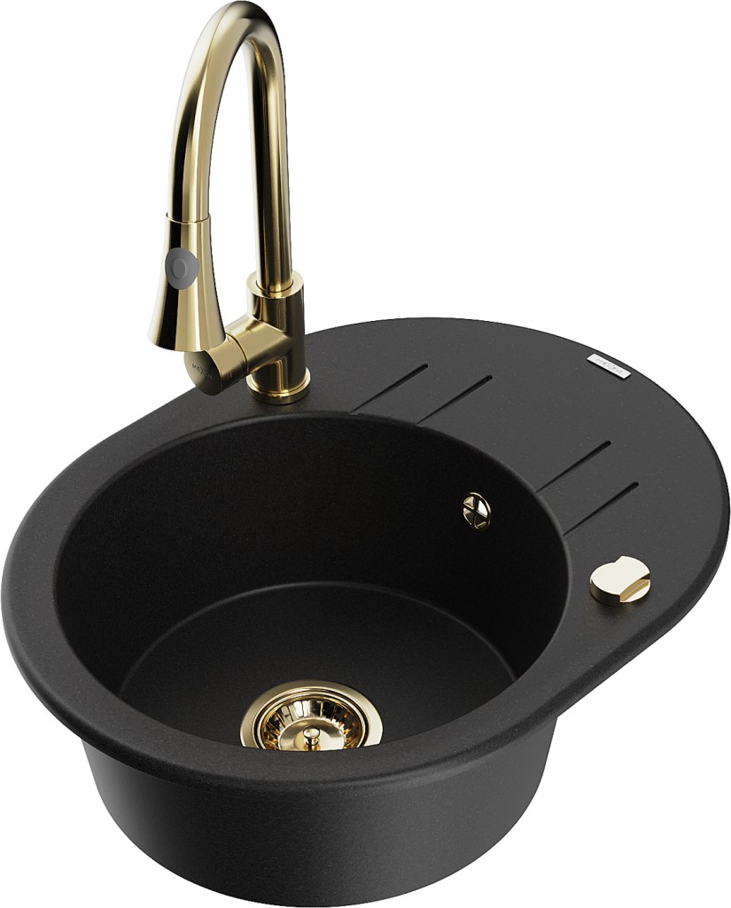 Technické dáta: drez: Rozmer: 586 x 458 x 190 mm Hĺbka komory: 180 mm Šírka komory: 378x374 mm Priemer odtoku: ø90 mm Typ: 1-miska s krátkym odkvapkávačom Typ: Zapustené do pracovnej dosky Čierna farba Povrchová úprava sifónu: zlatá Materiál: žula (80% žulové kamenivo, 20% živice) Prepadový otvor: Áno Otvory: (batérie, automatické) 2 Inštalácia: Univerzálna, je možné inštalovať s odkvapkávačom na ľavú alebo pravú stranu Vysoká odolnosť proti poškriabaniu a zmene farby Odolnosť proti tepelným šokom Ľahko čistiteľný povrch Dva dodatočné vyfrézované otvory na samodierovanie ø35 kuchynská batéria: Materiál: mosadz Farba: Zlatá Hlava: Keramická Prevzdušňovač: Áno Typ: Jedna páka Výška batérie: 380 mm Rozsah výtoku: 252 mm Typ výtoku: Výsuvný(GT) Ean: 5905315031891