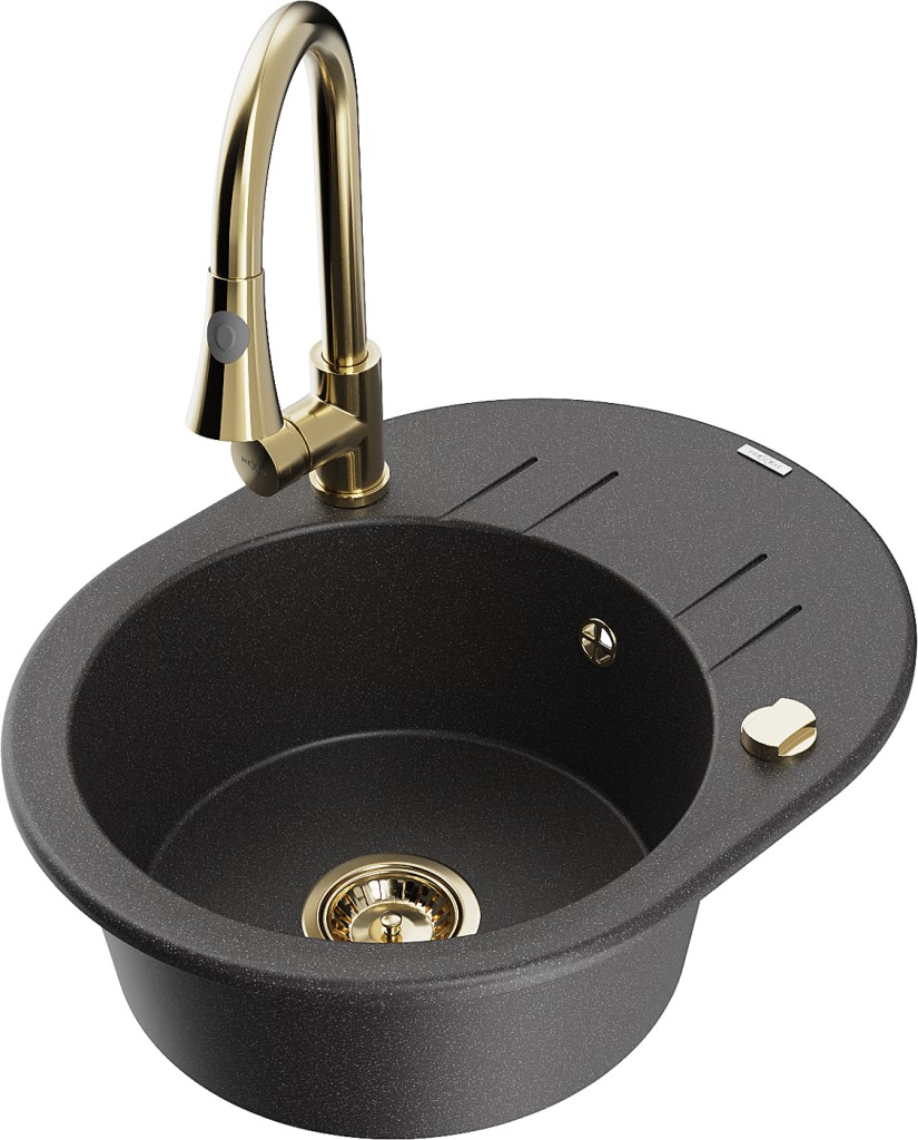 Technické dáta: drez: Rozmer: 586 x 458 x 190 mm Hĺbka komory: 180 mm Šírka komory: 378x374 mm Priemer odtoku: ø90 mm Typ: 1-miska s krátkym odkvapkávačom Typ: Zapustené do pracovnej dosky Farba: Škvrnitá čierna Povrchová úprava sifónu: zlatá Materiál: žula (80% žulové kamenivo, 20% živice) Prepadový otvor: Áno Otvory: (batérie, automatické) 2 Inštalácia: Univerzálna, je možné inštalovať s odkvapkávačom na ľavú alebo pravú stranu Vysoká odolnosť proti poškriabaniu a zmene farby Odolnosť proti tepelným šokom Ľahko čistiteľný povrch Dva dodatočné vyfrézované otvory na samodierovanie ø35 kuchynská batéria: Materiál: mosadz Farba: Zlatá Hlava: Keramická Prevzdušňovač: Áno Typ: Jedna páka Výška batérie: 380 mm Rozsah výtoku: 252 mm Typ výtoku: Výsuvný(GT) Ean: 5905315031846