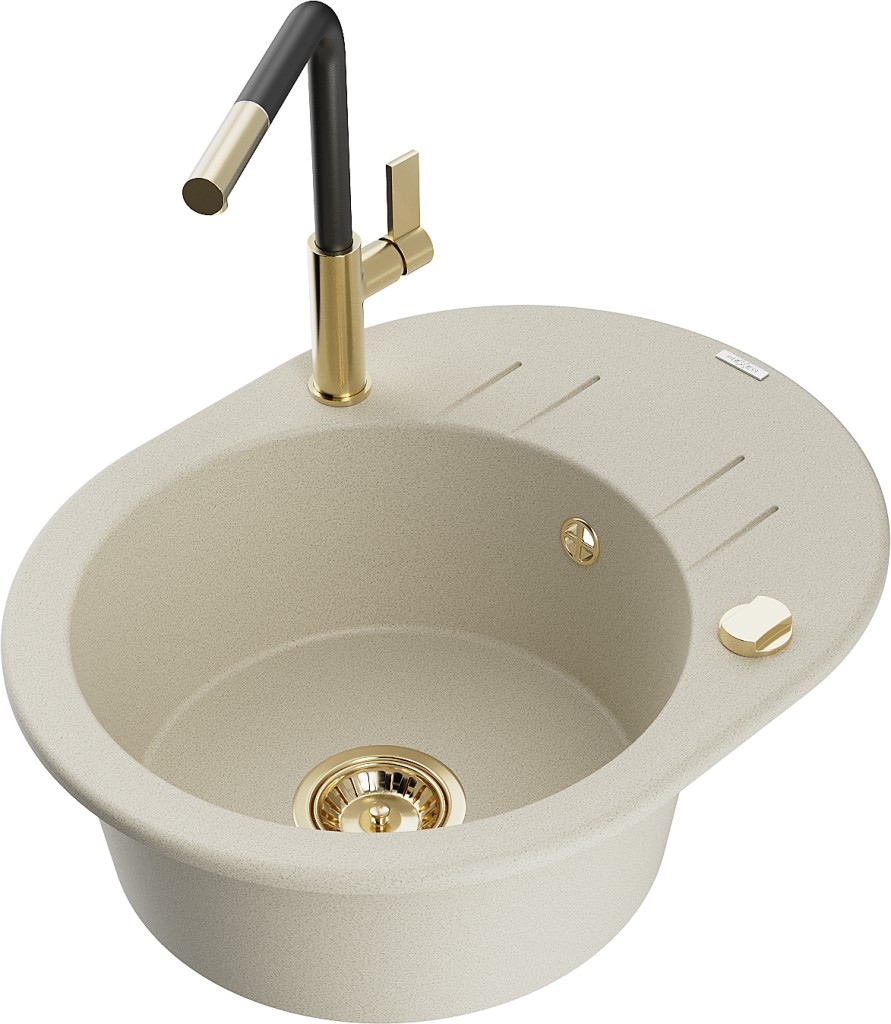 Technické dáta: Drez: Rozmer: 586x458x190 mm Hĺbka komory: 180 mm Šírka komory: 378x374 mm Priemer odtoku: ø90 mm Typ: 1-miska s krátkym odkvapkávačom Typ: Zapustené do pracovnej dosky Farba béžová Povrchová úprava sifónu: zlatá Materiál: žula (80% žulové kamenivo 20% živice) Prepadový otvor: Áno Otvory: (batérie, automat) 2 Inštalácia: Univerzálna, je možné inštalovať s odkvapkávačom na ľavú alebo pravú stranu Vysoká odolnosť proti poškriabaniu a zmene farby Odolnosť proti tepelným šokom Povrch pre ľahké čistenie Dva dodatočné vyfrézované otvory na samodierovanie ø35 Kuchynská batéria: Materiál: mosadz Farba: Zlatá/Čierna Hlava: Keramická Perlátor: Áno Typ: Jednopákové Rozsah výtoku: 245 mm Výška batérie: 307 mm(GT) Ean: 5905315063076