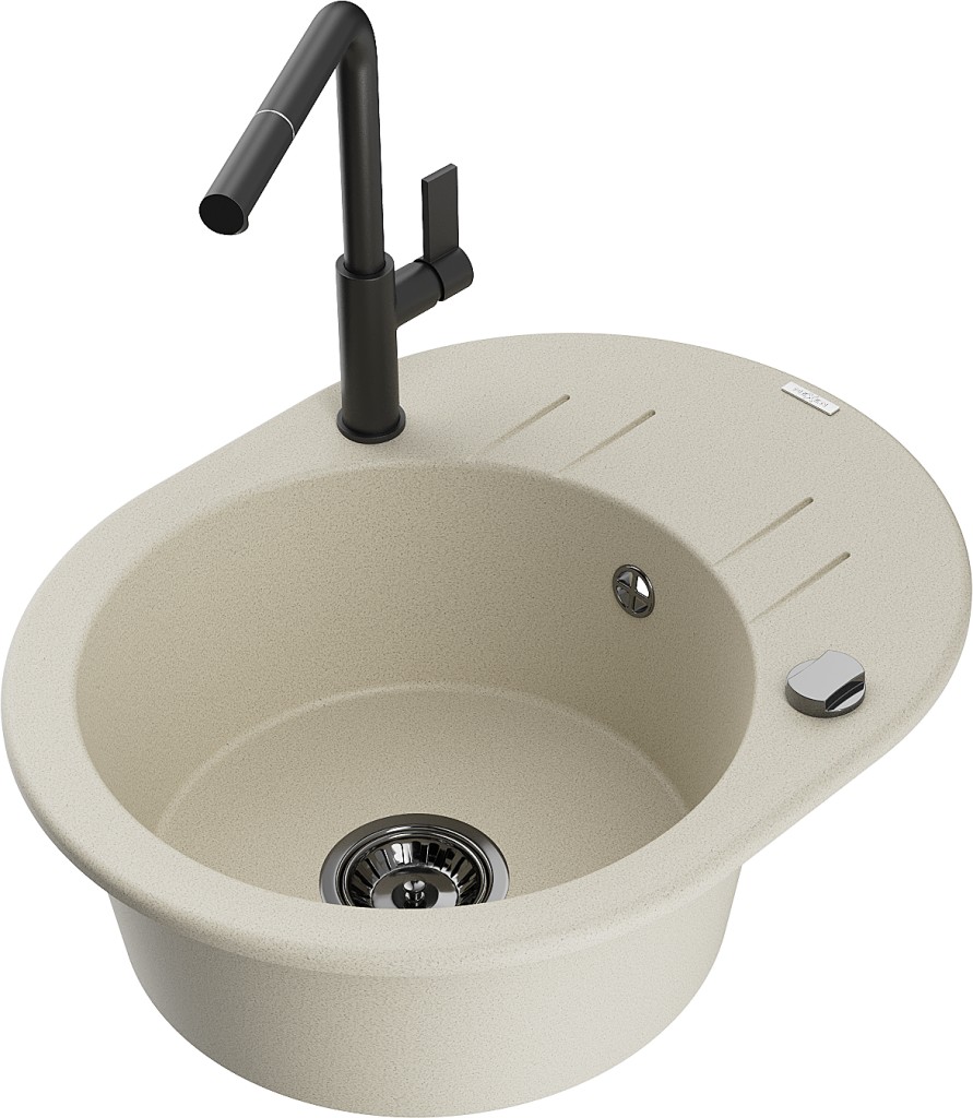 Technické dáta: Drez: Rozmer: 586x458x190 mm Hĺbka komory: 180 mm Šírka komory: 378x374 mm Priemer odtoku: ø90 mm Typ: 1-miska s krátkym odkvapkávačom Typ: Zapustené do pracovnej dosky Farba béžová Povrchová úprava sifónu: čierna Materiál: žula (80% žulové kamenivo 20% živice) Prepadový otvor: Áno Otvory: (batérie, automat) 2 Inštalácia: Univerzálna, je možné inštalovať s odkvapkávačom na ľavú alebo pravú stranu Vysoká odolnosť proti poškriabaniu a zmene farby Odolnosť proti tepelným šokom Povrch pre ľahké čistenie Dva dodatočné vyfrézované otvory na samodierovanie ø35 Kuchynská batéria: Materiál: mosadz Čierna farba Hlava: Keramická Perlátor: Áno Typ: Jednopákové Rozsah výtoku: 245 mm Výška batérie: 307 mm(GT) Ean: 5905315063090
