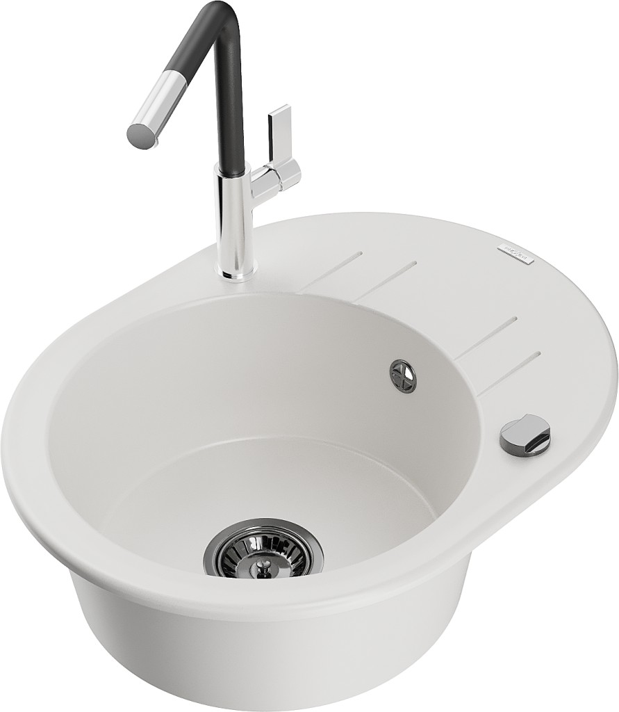 Technické dáta: drez: Rozmer: 586 x 458 x 190 mm Hĺbka komory: 180 mm Šírka komory: 378x374 mm Priemer odtoku: ø90 mm Typ: 1-miska s krátkym odkvapkávačom Typ: Zapustené do pracovnej dosky biela farba Povrchová úprava sifónu: čierna Materiál: žula (80% žulové kamenivo, 20% živice) Prepadový otvor: Áno Otvory: (batérie, automatické) 2 Inštalácia: Univerzálna, je možné inštalovať s odkvapkávačom na ľavú alebo pravú stranu Vysoká odolnosť proti poškriabaniu a zmene farby Odolnosť proti tepelným šokom Ľahko čistiteľný povrch Dva dodatočné vyfrézované otvory na samodierovanie ø35 kuchynská batéria: Materiál: mosadz Farba: chróm/čierna Hlava: Keramická Prevzdušňovač: Áno Typ: Jedna páka Rozsah výtoku: 245 mm Výška batérie: 307 mm(GT) Ean: 5905315062994
