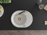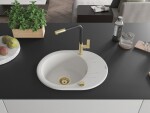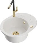 Technické dáta: drez: Rozmer: 586 x 458 x 190 mm Hĺbka komory: 180 mm Šírka komory: 378x374 mm Priemer odtoku: ø90 mm Typ: 1-miska s krátkym odkvapkávačom Typ: Zapustené do pracovnej dosky biela farba Povrchová úprava sifónu: zlatá Materiál: žula (80% žulové kamenivo, 20% živice) Prepadový otvor: Áno Otvory: (batérie, automatické) 2 Inštalácia: Univerzálna, je možné inštalovať s odkvapkávačom na ľavú alebo pravú stranu Vysoká odolnosť proti poškriabaniu a zmene farby Odolnosť proti tepelným šokom Ľahko čistiteľný povrch Dva dodatočné vyfrézované otvory na samodierovanie ø35 kuchynská batéria: Materiál: mosadz Farba: Zlatá/Čierna Hlava: Keramická Prevzdušňovač: Áno Typ: Jedna páka Rozsah výtoku: 245 mm Výška batérie: 307 mm(GT) Ean: 5905315063007