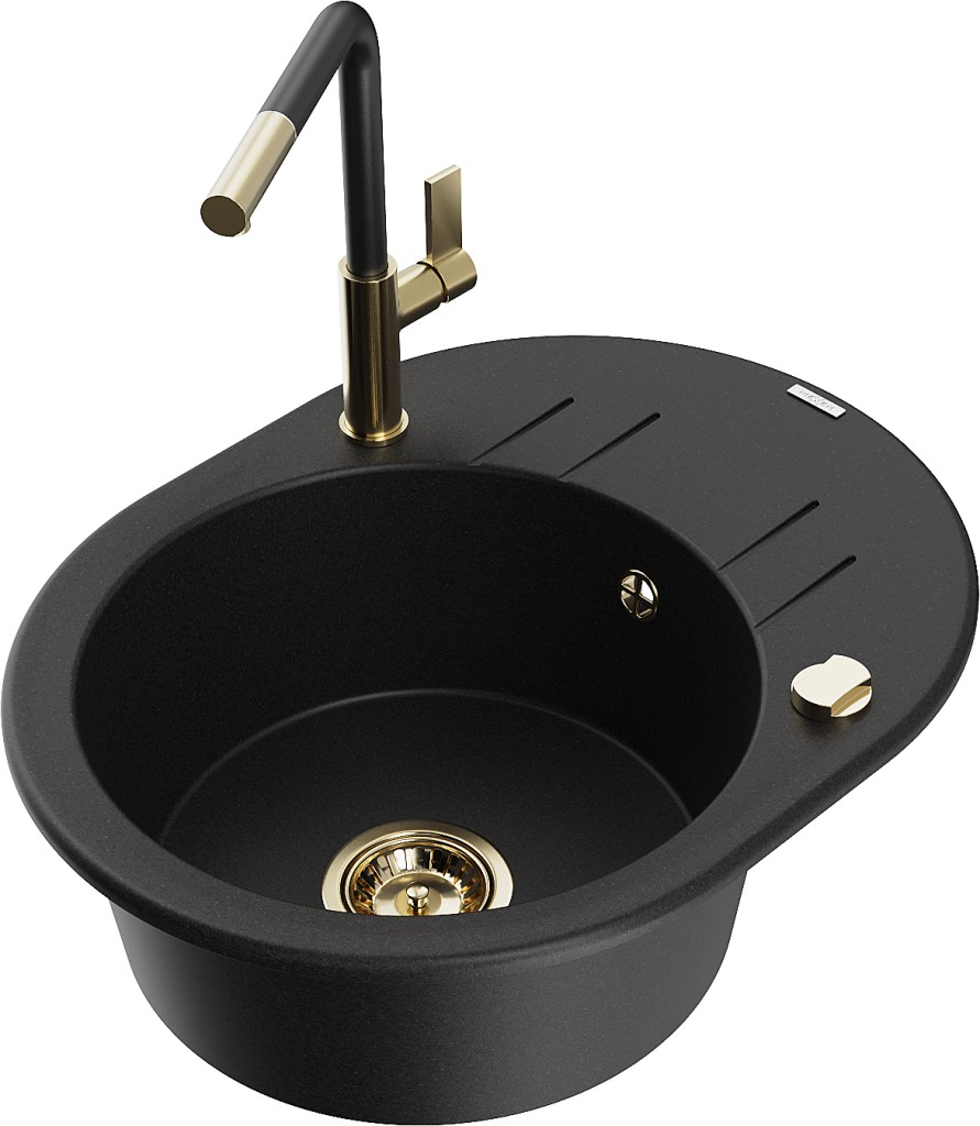 Technické dáta: drez: Rozmer: 586 x 458 x 190 mm Hĺbka komory: 180 mm Šírka komory: 378x374 mm Priemer odtoku: ø90 mm Typ: 1-miska s krátkym odkvapkávačom Typ: Zapustené do pracovnej dosky Čierna farba Povrchová úprava sifónu: zlatá Materiál: žula (80% žulové kamenivo, 20% živice) Prepadový otvor: Áno Otvory: (batérie, automatické) 2 Inštalácia: Univerzálna, je možné inštalovať s odkvapkávačom na ľavú alebo pravú stranu Vysoká odolnosť proti poškriabaniu a zmene farby Odolnosť proti tepelným šokom Ľahko čistiteľný povrch Dva dodatočné vyfrézované otvory na samodierovanie ø35 kuchynská batéria: Materiál: mosadz Farba: Zlatá/Čierna Hlava: Keramická Prevzdušňovač: Áno Typ: Jedna páka Rozsah výtoku: 245 mm Výška batérie: 307 mm(GT) Ean: 5905315063427