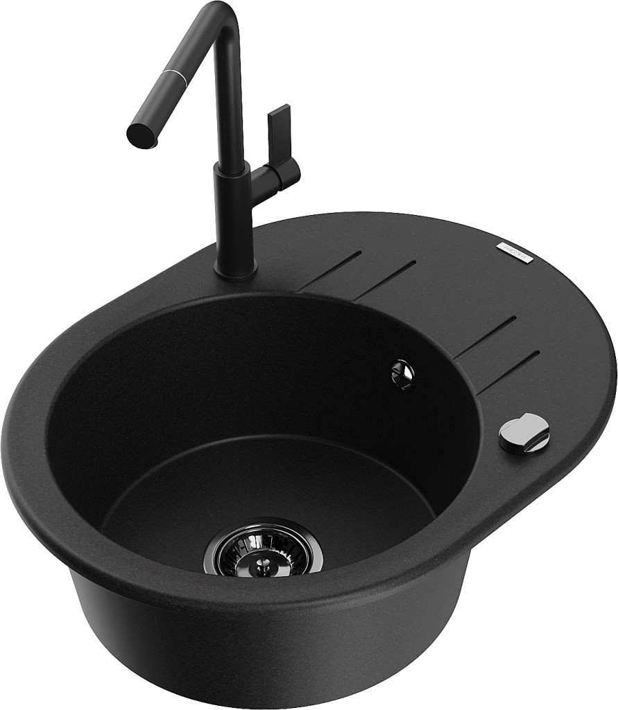Technické dáta: drez: Rozmer: 586 x 458 x 190 mm Hĺbka komory: 180 mm Šírka komory: 378x374 mm Priemer odtoku: ø90 mm Typ: 1-miska s krátkym odkvapkávačom Typ: Zapustené do pracovnej dosky Čierna farba Povrchová úprava sifónu: čierna Materiál: žula (80% žulové kamenivo, 20% živice) Prepadový otvor: Áno Otvory: (batérie, automatické) 2 Inštalácia: Univerzálna, je možné inštalovať s odkvapkávačom na ľavú alebo pravú stranu Vysoká odolnosť proti poškriabaniu a zmene farby Odolnosť proti tepelným šokom Ľahko čistiteľný povrch Dva dodatočné vyfrézované otvory na samodierovanie ø35 kuchynská batéria: Materiál: mosadz Čierna farba Hlava: Keramická Prevzdušňovač: Áno Typ: Jedna páka Rozsah výtoku: 245 mm Výška batérie: 307 mm(GT) Ean: 5905315063441