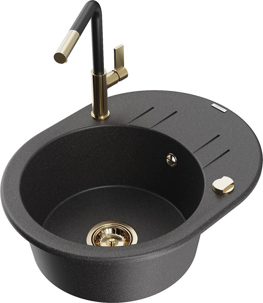 Technické dáta: drez: Rozmer: 586 x 458 x 190 mm Hĺbka komory: 180 mm Šírka komory: 378x374 mm Priemer odtoku: ø90 mm Typ: 1-miska s krátkym odkvapkávačom Typ: Zapustené do pracovnej dosky Farba: Škvrnitá čierna Povrchová úprava sifónu: zlatá Materiál: žula (80% žulové kamenivo, 20% živice) Prepadový otvor: Áno Otvory: (batérie, automatické) 2 Inštalácia: Univerzálna, je možné inštalovať s odkvapkávačom na ľavú alebo pravú stranu Vysoká odolnosť proti poškriabaniu a zmene farby Odolnosť proti tepelným šokom Ľahko čistiteľný povrch Dva dodatočné vyfrézované otvory na samodierovanie ø35 kuchynská batéria: Materiál: mosadz Farba: Zlatá/Čierna Hlava: Keramická Prevzdušňovač: Áno Typ: Jedna páka Rozsah výtoku: 245 mm Výška batérie: 307 mm(GT) Ean: 5905315063342