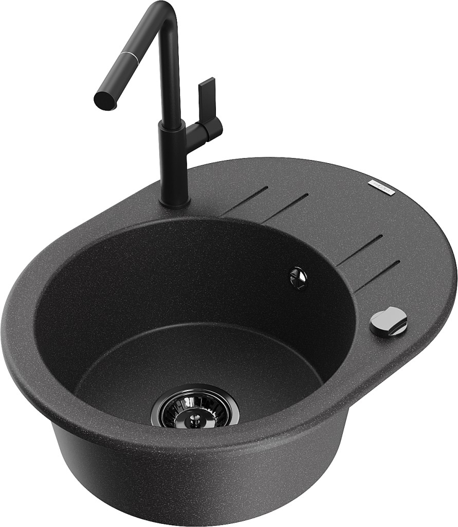 Technické dáta: drez: Rozmer: 586 x 458 x 190 mm Hĺbka komory: 180 mm Šírka komory: 378x374 mm Priemer odtoku: ø90 mm Typ: 1-miska s krátkym odkvapkávačom Typ: Zapustené do pracovnej dosky Farba: Škvrnitá čierna Povrchová úprava sifónu: čierna Materiál: žula (80% žulové kamenivo, 20% živice) Prepadový otvor: Áno Otvory: (batérie, automatické) 2 Inštalácia: Univerzálna, je možné inštalovať s odkvapkávačom na ľavú alebo pravú stranu Vysoká odolnosť proti poškriabaniu a zmene farby Odolnosť proti tepelným šokom Ľahko čistiteľný povrch Dva dodatočné vyfrézované otvory na samodierovanie ø35 kuchynská batéria: Materiál: mosadz Čierna farba Hlava: Keramická Prevzdušňovač: Áno Typ: Jedna páka Rozsah výtoku: 245 mm Výška batérie: 307 mm(GT) Ean: 5905315063366