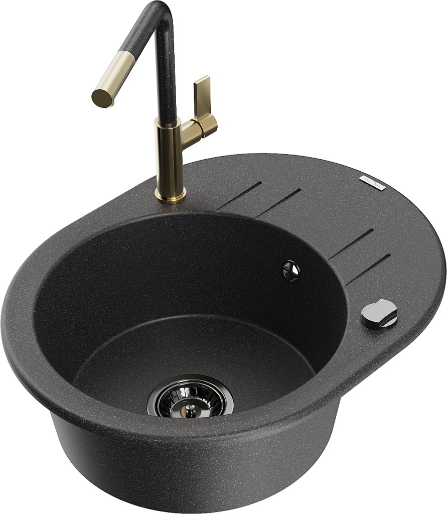 Technické dáta: drez: Rozmer: 586 x 458 x 190 mm Hĺbka komory: 180 mm Šírka komory: 378x374 mm Priemer odtoku: ø90 mm Typ: 1-miska s krátkym odkvapkávačom Typ: Zapustené do pracovnej dosky Farba: Škvrnitá čierna Povrchová úprava sifónu: čierna Materiál: žula (80% žulové kamenivo, 20% živice) Prepadový otvor: Áno Otvory: (batérie, automatické) 2 Inštalácia: Univerzálna, je možné inštalovať s odkvapkávačom na ľavú alebo pravú stranu Vysoká odolnosť proti poškriabaniu a zmene farby Odolnosť proti tepelným šokom Ľahko čistiteľný povrch Dva dodatočné vyfrézované otvory na samodierovanie ø35 kuchynská batéria: Materiál: mosadz Farba: zlatá/čierna škvrnitá Hlava: Keramická Prevzdušňovač: Áno Typ: Jedna páka Rozsah výtoku: 245 mm Výška batérie: 307 mm(GT) Ean: 5905315063380