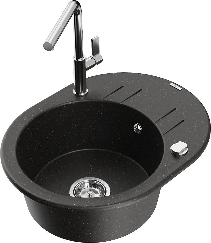 Technické údaje: Kuchynský drez: Rozmery: 586x458x190 mm Hĺbka komory: 180 mm Šírka komory: 378x374 mm Priemer odtoku: ø90 mm Typ: 1 drez s krátkym odkvapkávačom Typ: Zapustený Farba: Čierna/Zlatá metalíza Povrchová úprava sifónu: Chróm Materiál: Žula (80% žulového kameniva, 20% živíc) Prepadový otvor: Áno Otvory: (batériové, automatické) 2 Inštalácia: Univerzálna, je možné inštalovať s odtokom na ľavej alebo pravej strane Vysoká odolnosť proti poškriabaniu a zafarbeniu Odolnosť proti tepelným šokom Ľahko čistiteľný povrch Dva ďalšie frézované otvory na samodierovanie ø35 Kuchynská batéria: Materiál: Mosadz Farba: Chróm Hlava: Keramika Prevzdušňovač: Áno Typ: Jednopákový Dosah výtoku: 245 mm Výška batérie: 307 mm(GT) Ean: 5905315063236