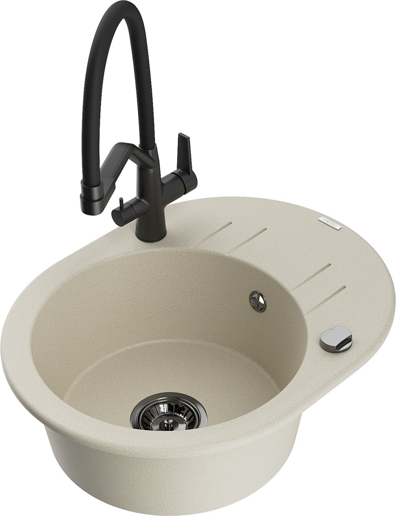 Technické dáta: Drez: Rozmer: 586x458x190 mm Hĺbka komory: 180 mm Šírka komory: 378x374 mm Priemer odtoku: ø90 mm Typ: 1-miska s krátkym odkvapkávačom Typ: Zapustené do pracovnej dosky Farba béžová Povrchová úprava sifónu: čierna Materiál: žula (80% žulové kamenivo 20% živice) Prepadový otvor: Áno Otvory: (batérie, automat) 2 Inštalácia: Univerzálna, je možné inštalovať s odkvapkávačom na ľavú alebo pravú stranu Vysoká odolnosť proti poškriabaniu a zmene farby Odolnosť proti tepelným šokom Povrch pre ľahké čistenie Dva dodatočné vyfrézované otvory na samodierovanie ø35 Kuchynská batéria: Materiál: mosadz Čierna farba Hlavy: Keramické Perlátor: Áno Typ výtoku: Flexibilný s mosadznou podperou Rozsah výtoku: 260 mm Výška: 405 mm Typ: Dve rukoväte Dvojhlavá batéria s prídavným filtrom na pitnú vodu(GT) Ean: 5905315055224