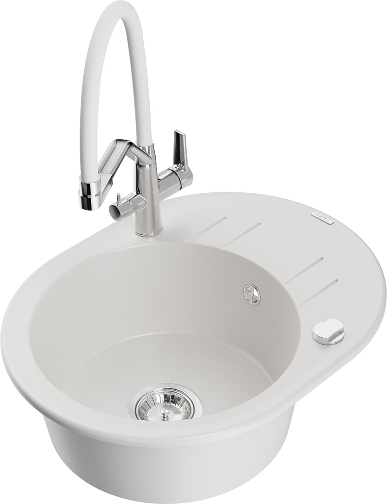 Technické dáta: Drez: Rozmer: 586x458x190 mm Hĺbka komory: 180 mm Šírka komory: 378x374 mm Priemer odtoku: ø90 mm Typ: 1-miska s krátkym odkvapkávačom Typ: Zapustené do pracovnej dosky biela farba Povrchová úprava sifónu: Chrome Materiál: žula (80% žulové kamenivo 20% živice) Prepadový otvor: Áno Otvory: (batérie, automat) 2 Inštalácia: Univerzálna, je možné inštalovať s odkvapkávačom na ľavú alebo pravú stranu Vysoká odolnosť proti poškriabaniu a zmene farby Odolnosť proti tepelným šokom Povrch pre ľahké čistenie Dva dodatočné vyfrézované otvory na samodierovanie ø35 Kuchynská batéria: Materiál: mosadz Farba: chróm/biela Hlavy: Keramické Perlátor: Áno Typ výtoku: Flexibilný s mosadzným držiakom Rozsah výtoku: 260 mm Výška: 405 mm Typ: Dve rukoväte Dvojhlavá batéria s prídavným filtrom na pitnú vodu(GT) Ean: 5905315055118
