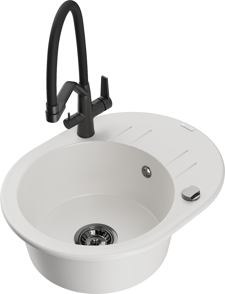 Technické dáta: Drez: Rozmer: 586x458x190 mm Hĺbka komory: 180 mm Šírka komory: 378x374 mm Priemer odtoku: ø90 mm Typ: 1-miska s krátkym odkvapkávačom Typ: Zapustené do pracovnej dosky biela farba Povrchová úprava sifónu: čierna Materiál: žula (80% žulové kamenivo 20% živice) Prepadový otvor: Áno Otvory: (batérie, automat) 2 Inštalácia: Univerzálna, je možné inštalovať s odkvapkávačom na ľavú alebo pravú stranu Vysoká odolnosť proti poškriabaniu a zmene farby Odolnosť proti tepelným šokom Povrch pre ľahké čistenie Dva dodatočné vyfrézované otvory na samodierovanie ø35 Kuchynská batéria: Materiál: mosadz Čierna farba Hlavy: Keramické Perlátor: Áno Typ výtoku: Flexibilný s mosadzným držiakom Rozsah výtoku: 260 mm Výška: 405 mm Typ: Dve rukoväte Dvojhlavá batéria s prídavným filtrom na pitnú vodu(GT) Ean: 5905315055163