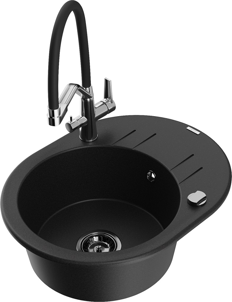 Technické dáta: drez: Rozmer: 586 x 458 x 190 mm Hĺbka komory: 180 mm Šírka komory: 378x374 mm Priemer odtoku: ø90 mm Typ: 1-miska s krátkym odkvapkávačom Typ: Zapustené do pracovnej dosky Čierna farba Povrchová úprava sifónu: čierna Materiál: žula (80% žulové kamenivo, 20% živice) Prepadový otvor: Áno Otvory: (batérie, automatické) 2 Inštalácia: Univerzálna, je možné inštalovať s odkvapkávačom na ľavú alebo pravú stranu Vysoká odolnosť proti poškriabaniu a zmene farby Odolnosť proti tepelným šokom Ľahko čistiteľný povrch Dva dodatočné vyfrézované otvory na samodierovanie ø35 kuchynská batéria: Materiál: mosadz Farba: chróm/čierna Hlavy: Keramické Prevzdušňovač: Áno Typ hubica: Flexibilný s mosadzným držiakom Rozsah výtoku: 260 mm Výška: 405 mm Typ: Dve rukoväte Dvojhlavá batéria s prídavným filtrom na pitnú vodu(GT) Ean: 5905315055491