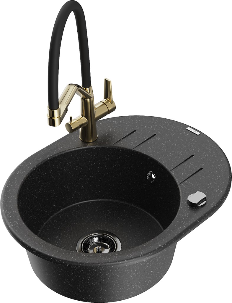 Technické dáta: drez: Rozmer: 586 x 458 x 190 mm Hĺbka komory: 180 mm Šírka komory: 378x374 mm Priemer odtoku: ø90 mm Typ: 1-miska s krátkym odkvapkávačom Typ: Zapustené do pracovnej dosky Farba: čierna/strieborná metalíza Povrchová úprava sifónu: čierna Materiál: žula (80% žulové kamenivo, 20% živice) Prepadový otvor: Áno Otvory: (batérie, automatické) 2 Inštalácia: Univerzálna, je možné inštalovať s odkvapkávačom na ľavú alebo pravú stranu Vysoká odolnosť proti poškriabaniu a zmene farby Odolnosť proti tepelným šokom Ľahko čistiteľný povrch Dva dodatočné vyfrézované otvory na samodierovanie ø35 kuchynská batéria: Materiál: mosadz Farba: Zlatá/Čierna Hlavy: Keramické Prevzdušňovač: Áno Typ hubica: Flexibilný s mosadzným držiakom Rozsah výtoku: 260 mm Výška: 405 mm Typ: Dve rukoväte Dvojhlavá batéria s prídavným filtrom na pitnú vodu(GT) Ean: 5905315055330