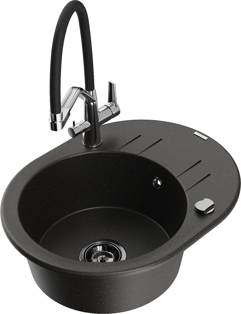Technické údaje: Kuchynský drez: Rozmery: 586x458x190 mm Hĺbka komory: 180 mm Šírka komory: 378x374 mm Priemer odtoku: ø90 mm Typ: 1 drez s krátkym odkvapkávačom Typ: Zapustený Farba: Čierna/Zlatá metalíza Povrchová úprava sifónu: Čierna Materiál: Žula (80% žulového kameniva, 20% živíc) Prepadový otvor: Áno Otvory: (batériové, automatické) 2 Inštalácia: Univerzálna, je možné inštalovať s odtokom na ľavej alebo pravej strane Vysoká odolnosť proti poškriabaniu a zafarbeniu Odolnosť proti tepelným šokom Ľahko čistiteľný povrch Dva ďalšie frézované otvory na samodierovanie ø35 Kuchynská batéria: Materiál: Mosadz Farba: Chróm/Čierna Hlavy: Keramické Prevzdušňovač: Áno Typ výtoku: Flexibilný s mosadznou podperou Dosah výtoku: 260 mm Výška: 405 mm Typ: Dvojpákový Dvojhlavý kohútik s prídavným filtrom na pitnú vodu(GT) Ean: 5905315055378