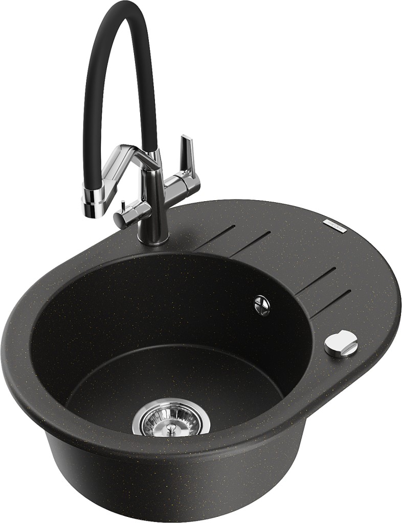 Technické údaje: Kuchynský drez: Rozmery: 586x458x190 mm Hĺbka komory: 180 mm Šírka komory: 378x374 mm Priemer odtoku: ø90 mm Typ: 1 drez s krátkym odkvapkávačom Typ: Zapustený Farba: Čierna/Zlatá metalíza Povrchová úprava sifónu: Chróm Materiál: Žula (80% žulového kameniva, 20% živíc) Prepadový otvor: Áno Otvory: (batériové, automatické) 2 Inštalácia: Univerzálna, je možné inštalovať s odtokom na ľavej alebo pravej strane Vysoká odolnosť proti poškriabaniu a zafarbeniu Odolnosť proti tepelným šokom Ľahko čistiteľný povrch Dva ďalšie frézované otvory na samodierovanie ø35 Kuchynská batéria: Materiál: Mosadz Farba: Chróm/Čierna Hlavy: Keramické Prevzdušňovač: Áno Typ výtoku: Flexibilný s mosadznou podperou Dosah výtoku: 260 mm Výška: 405 mm Typ: Dvojpákový Dvojhlavý kohútik s prídavným filtrom na pitnú vodu(GT) Ean: 5905315055361