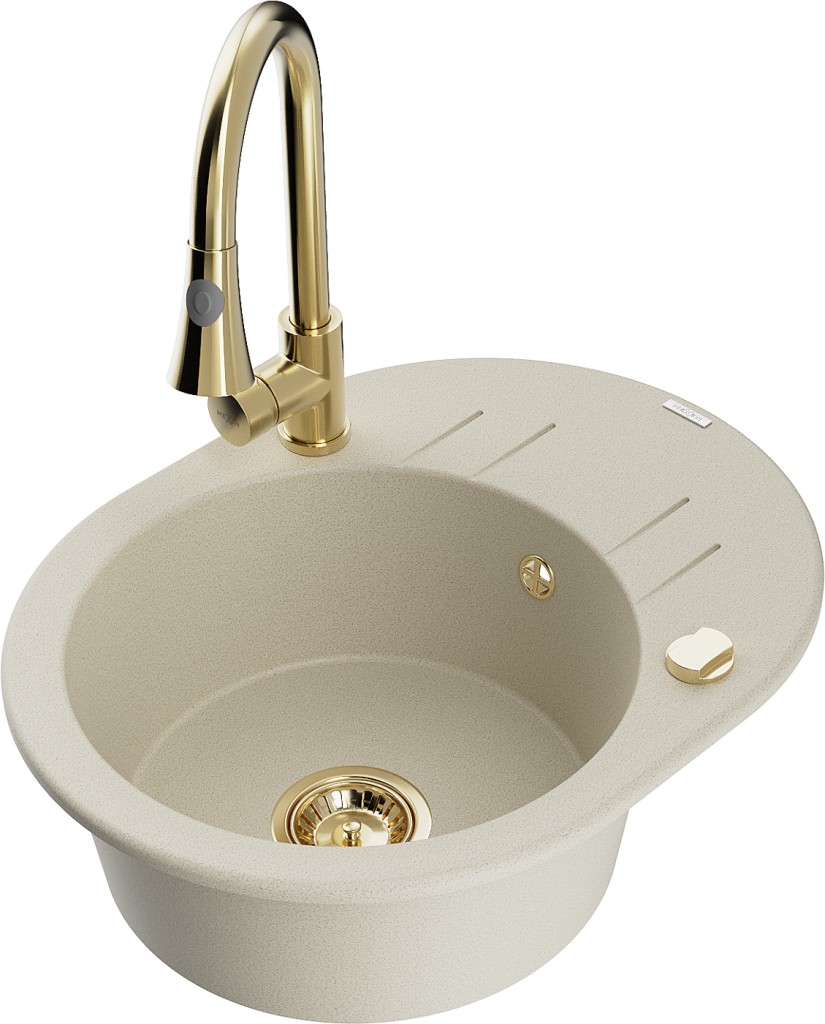 Technické dáta: Drez: Rozmer: 586x458x190 mm Hĺbka komory: 180 mm Šírka komory: 378x374 mm Priemer odtoku: ø90 mm Typ: 1-miska s krátkym odkvapkávačom Typ: Zapustené do pracovnej dosky Farba béžová Povrchová úprava sifónu: zlatá Materiál: žula (80% žulové kamenivo 20% živice) Prepadový otvor: Áno Otvory: (batérie, automat) 2 Inštalácia: Univerzálna, je možné inštalovať s odkvapkávačom na ľavú alebo pravú stranu Vysoká odolnosť proti poškriabaniu a zmene farby Odolnosť proti tepelným šokom Povrch pre ľahké čistenie Dva dodatočné vyfrézované otvory na samodierovanie ø35 Kuchynská batéria: Materiál: mosadz Farba: Zlatá Hlava: Keramická Perlátor: Áno Typ: Jednopákové Výška batérie: 380 mm Rozsah výtoku: 252 mm Typ výtoku: Výsuvný(GT) Ean: 5905315031679