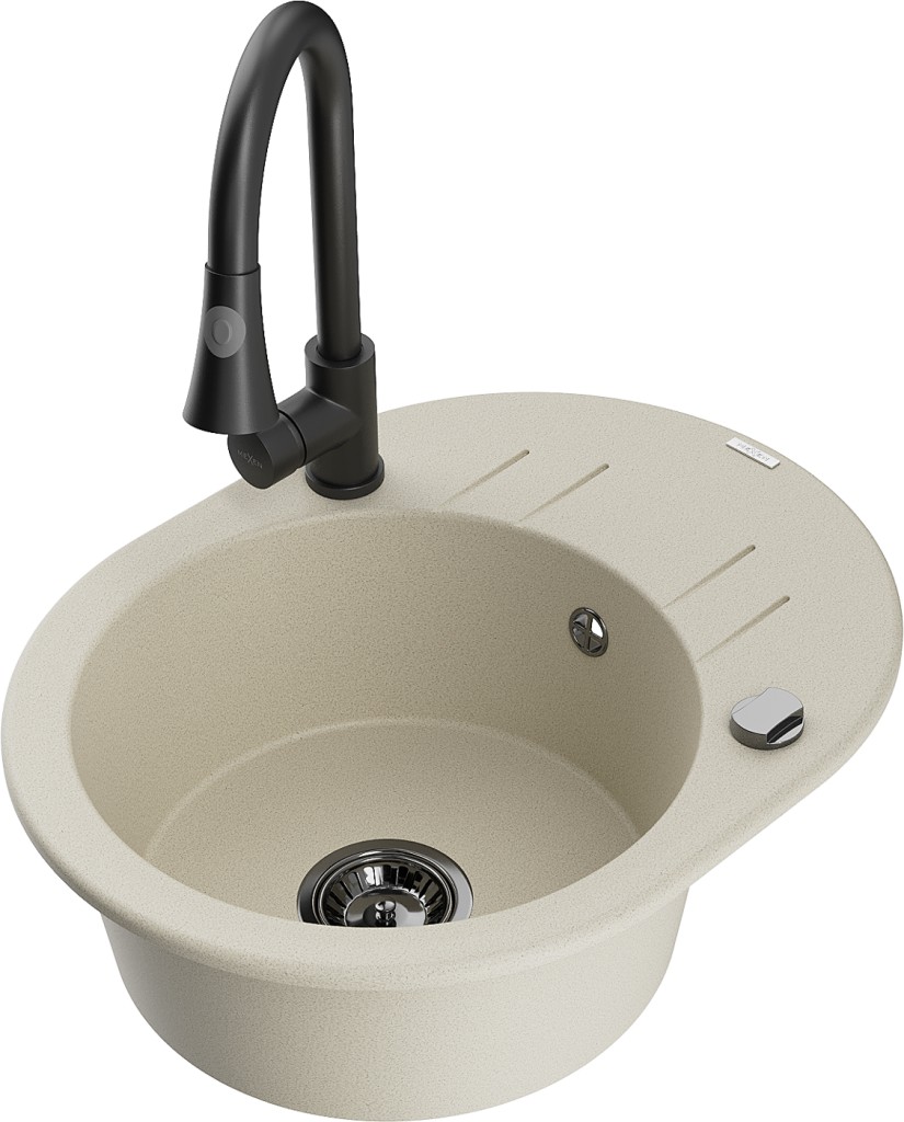 Technické dáta: Drez: Rozmer: 586x458x190 mm Hĺbka komory: 180 mm Šírka komory: 378x374 mm Priemer odtoku: ø90 mm Typ: 1-miska s krátkym odkvapkávačom Typ: Zapustené do pracovnej dosky Farba béžová Povrchová úprava sifónu: čierna Materiál: žula (80% žulové kamenivo 20% živice) Prepadový otvor: Áno Otvory: (batérie, automat) 2 Inštalácia: Univerzálna, je možné inštalovať s odkvapkávačom na ľavú alebo pravú stranu Vysoká odolnosť proti poškriabaniu a zmene farby Odolnosť proti tepelným šokom Povrch pre ľahké čistenie Dva dodatočné vyfrézované otvory na samodierovanie ø35 Kuchynská batéria: Materiál: mosadz Čierna farba Hlava: Keramická Perlátor: Áno Typ: Jednopákové Výška batérie: 380 mm Rozsah výtoku: 252 mm Typ výtoku: Výsuvný(GT) Ean: 5905315031686