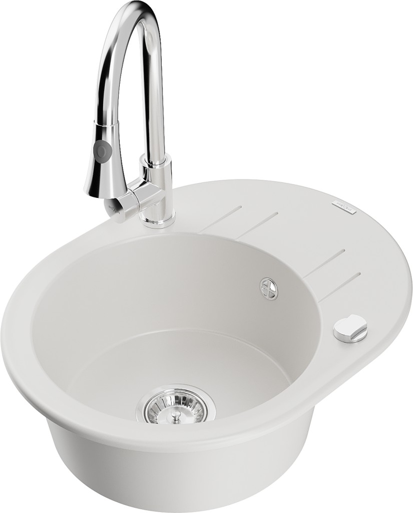 Technické dáta: drez: Rozmer: 586 x 458 x 190 mm Hĺbka komory: 180 mm Šírka komory: 378x374 mm Priemer odtoku: ø90 mm Typ: 1-miska s krátkym odkvapkávačom Typ: Zapustené do pracovnej dosky biela farba Povrchová úprava sifónu: Chrome Materiál: žula (80% žulové kamenivo, 20% živice) Prepadový otvor: Áno Otvory: (batérie, automatické) 2 Inštalácia: Univerzálna, je možné inštalovať s odkvapkávačom na ľavú alebo pravú stranu Vysoká odolnosť proti poškriabaniu a zmene farby Odolnosť proti tepelným šokom Ľahko čistiteľný povrch Dva dodatočné vyfrézované otvory na samodierovanie ø35 kuchynská batéria: Materiál: mosadz Farba: Chrome Hlava: Keramická Prevzdušňovač: Áno Typ: Jedna páka Výška batérie: 380 mm Rozsah výtoku: 252 mm Typ výtoku: Výsuvný(GT) Ean: 5905315031617