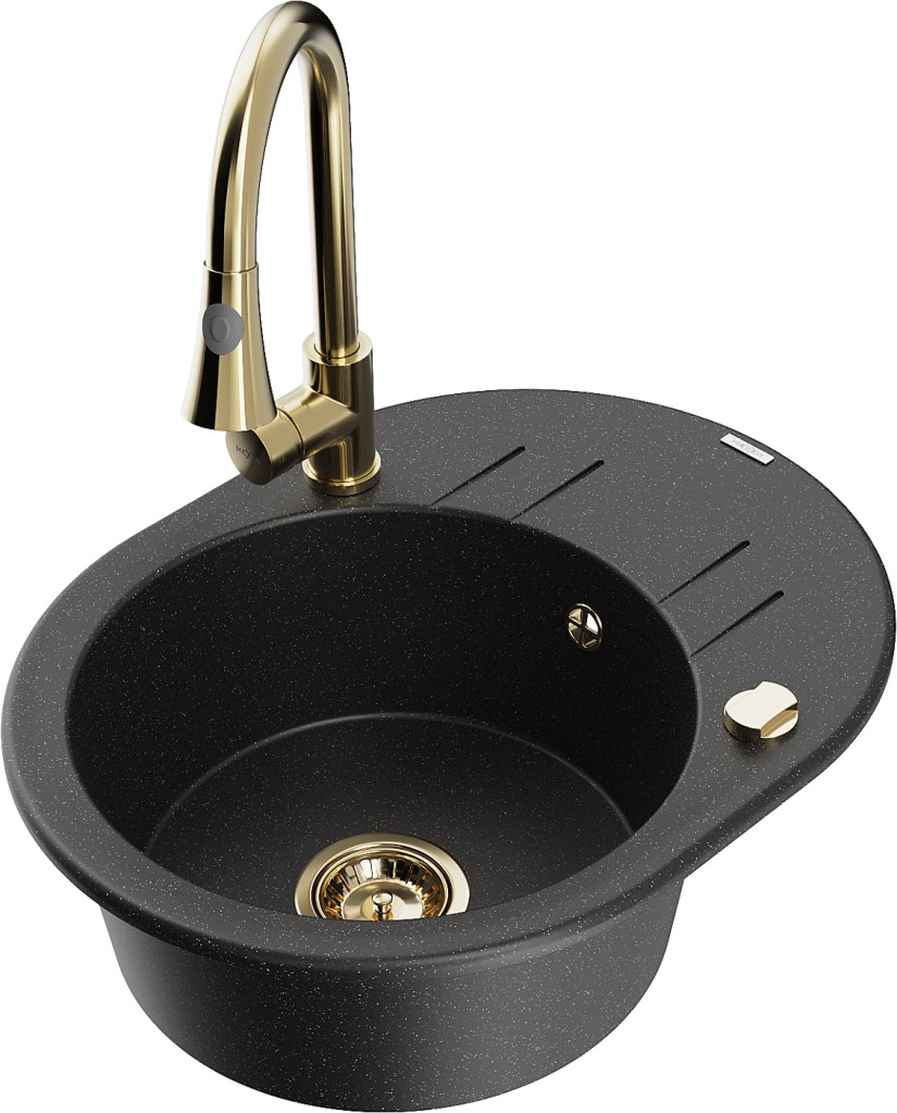 Technické dáta: drez: Rozmer: 586 x 458 x 190 mm Hĺbka komory: 180 mm Šírka komory: 378x374 mm Priemer odtoku: ø90 mm Typ: 1-miska s krátkym odkvapkávačom Typ: Zapustené do pracovnej dosky Farba: čierna/strieborná metalíza Povrchová úprava sifónu: zlatá Materiál: žula (80% žulové kamenivo, 20% živice) Prepadový otvor: Áno Otvory: (batérie, automatické) 2 Inštalácia: Univerzálna, je možné inštalovať s odkvapkávačom na ľavú alebo pravú stranu Vysoká odolnosť proti poškriabaniu a zmene farby Odolnosť proti tepelným šokom Ľahko čistiteľný povrch Dva dodatočné vyfrézované otvory na samodierovanie ø35 kuchynská batéria: Materiál: mosadz Farba: Zlatá Hlava: Keramická Prevzdušňovač: Áno Typ: Jedna páka Výška batérie: 380 mm Rozsah výtoku: 252 mm Typ výtoku: Výsuvný(GT) Ean: 5905315031754