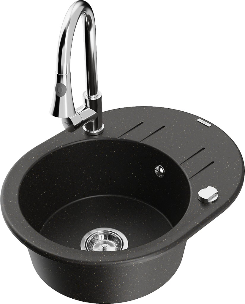Technické údaje: Kuchynský drez: Rozmery: 586x458x190 mm Hĺbka komory: 180 mm Šírka komory: 378x374 mm Priemer odtoku: ø90 mm Typ: 1 drez s krátkym odkvapkávačom Typ: Zapustený Farba: Čierna/Zlatá metalíza Povrchová úprava sifónu: Chróm Materiál: Žula (80% žulového kameniva, 20% živíc) Prepadový otvor: Áno Otvory: (batériové, automatické) 2 Inštalácia: Univerzálna, je možné inštalovať s odtokom na ľavej alebo pravej strane Vysoká odolnosť proti poškriabaniu a zafarbeniu Odolnosť proti tepelným šokom Ľahko čistiteľný povrch Dva ďalšie frézované otvory na samodierovanie ø35 Kuchynská batéria: Materiál: Mosadz Farba: Chróm Hlava: Keramika Prevzdušňovač: Áno Typ: Jednopákový Výška batérie: 380 mm Dosah výtoku: 252 mm Typ výtoku: Výsuvný(GT) Ean: 5905315031785