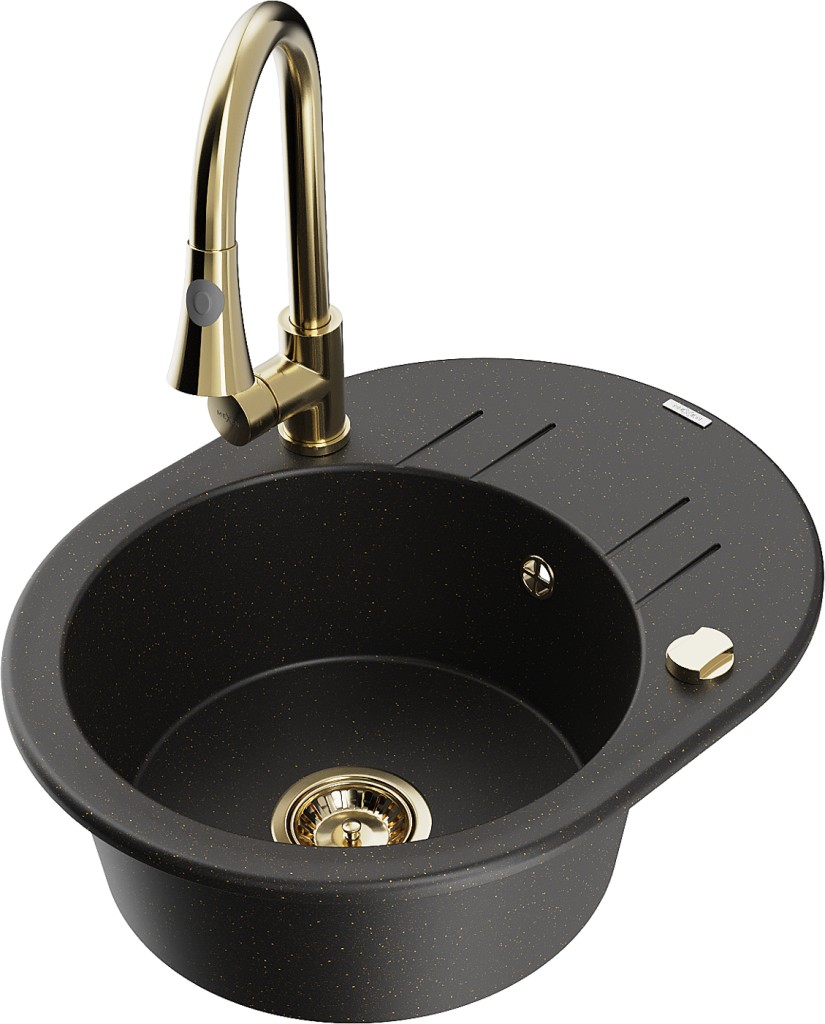 Technické údaje: Kuchynský drez: Rozmery: 586x458x190 mm Hĺbka komory: 180 mm Šírka komory: 378x374 mm Priemer odtoku: ø90 mm Typ: 1 drez s krátkym odkvapkávačom Typ: Zapustený Farba: Čierna/Zlatá metalíza Povrchová úprava sifónu: Zlatá Materiál: Žula (80% žulového kameniva, 20% živíc) Prepadový otvor: Áno Otvory: (batériové, automatické) 2 Inštalácia: Univerzálna, je možné inštalovať s odtokom na ľavej alebo pravej strane Vysoká odolnosť proti poškriabaniu a zafarbeniu Odolnosť proti tepelným šokom Ľahko čistiteľný povrch Dva ďalšie frézované otvory na samodierovanie ø35 Kuchynská batéria: Materiál: Mosadz Farba: Zlatá Hlava: Keramika Prevzdušňovač: Áno Typ: Jednopákový Výška batérie: 380 mm Dosah výtoku: 252 mm Typ výtoku: Výsuvný(GT) Ean: 5905315031792