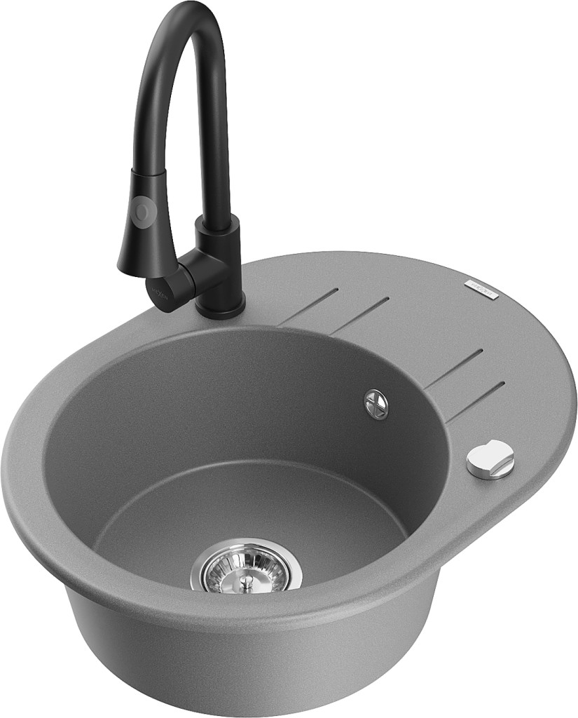 Technické dáta: drez: Rozmer: 586 x 458 x 190 mm Hĺbka komory: 180 mm Šírka komory: 378x374 mm Priemer odtoku: ø90 mm Typ: 1-miska s krátkym odkvapkávačom Typ: Zapustené do pracovnej dosky Šedá farba Povrchová úprava sifónu: Chrome Materiál: žula (80% žulové kamenivo, 20% živice) Prepadový otvor: Áno Otvory: (batérie, automatické) 2 Inštalácia: Univerzálna, je možné inštalovať s odkvapkávačom na ľavú alebo pravú stranu Vysoká odolnosť proti poškriabaniu a zmene farby Odolnosť proti tepelným šokom Ľahko čistiteľný povrch Dva dodatočné vyfrézované otvory na samodierovanie ø35 kuchynská batéria: Materiál: mosadz Čierna farba Hlava: Keramická Prevzdušňovač: Áno Typ: Jedna páka Výška batérie: 380 mm Rozsah výtoku: 252 mm Typ výtoku: Výsuvný(GT) Ean: 5905315031716
