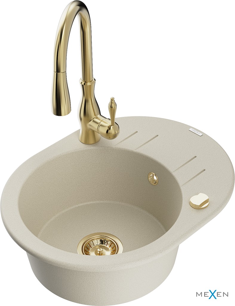 Technické dáta: drez: Rozmer: 586 x 458 x 190 mm Hĺbka komory: 180 mm Rozmery komory: 378x374 mm Priemer odtoku: ø90 mm Typ: 1-miska s krátkym odkvapkávačom Typ: Zapustené do pracovnej dosky Farba béžová Povrchová úprava sifónu: zlatá Materiál: žula (80% žulové kamenivo, 20% živice) Prepadový otvor: Áno Otvory: (batérie, automatické) 2 Inštalácia: Univerzálna, je možné inštalovať s odkvapkávačom na ľavú alebo pravú stranu Vysoká odolnosť proti poškriabaniu a zmene farby Odolnosť proti tepelným šokom Ľahko čistiteľný povrch Dva dodatočné vyfrézované otvory na samodierovanie ø35 kuchynská batéria: Materiál: mosadz Farba: Zlatá Hlava: Keramická Prevzdušňovač: Áno Typ: Jedna páka Výška batérie: 410 mm Rozsah výtoku: 231 mm(GT) Ean: 5905315036780