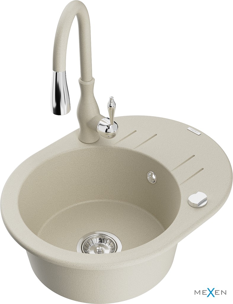 Technické dáta: drez: Rozmer: 586 x 458 x 190 mm Hĺbka komory: 180 mm Rozmery komory: 378x374 mm Priemer odtoku: ø90 mm Typ: 1-miska s krátkym odkvapkávačom Typ: Zapustené do pracovnej dosky Farba béžová Povrchová úprava sifónu: Chrome Materiál: žula (80% žulové kamenivo, 20% živice) Prepadový otvor: Áno Otvory: (batérie, automatické) 2 Inštalácia: Univerzálna, je možné inštalovať s odkvapkávačom na ľavú alebo pravú stranu Vysoká odolnosť proti poškriabaniu a zmene farby Odolnosť proti tepelným šokom Ľahko čistiteľný povrch Dva dodatočné vyfrézované otvory na samodierovanie ø35 kuchynská batéria: Materiál: mosadz Farba béžová Hlava: Keramická Prevzdušňovač: Áno Typ: Jedna páka Výška batérie: 410 mm Rozsah výtoku: 231 mm(GT) Ean: 5905315036773