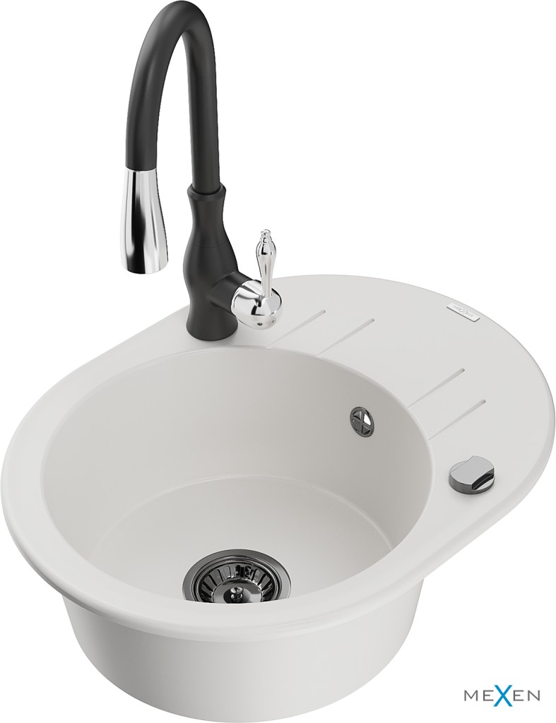 Technické dáta: drez: Rozmer: 586 x 458 x 190 mm Hĺbka komory: 180 mm Rozmery komory: 378x374 mm Priemer odtoku: ø90 mm Typ: 1-miska s krátkym odkvapkávačom Typ: Zapustené do pracovnej dosky biela farba Povrchová úprava sifónu: čierna Materiál: žula (80% žulové kamenivo, 20% živice) Prepadový otvor: Áno Otvory: (batérie, automatické) 2 Inštalácia: Univerzálna, je možné inštalovať s odkvapkávačom na ľavú alebo pravú stranu Vysoká odolnosť proti poškriabaniu a zmene farby Odolnosť proti tepelným šokom Ľahko čistiteľný povrch Dva dodatočné vyfrézované otvory na samodierovanie ø35 kuchynská batéria: Materiál: mosadz Čierna farba Hlava: Keramická Prevzdušňovač: Áno Typ: Jedna páka Výška batérie: 410 mm Rozsah výtoku: 231 mm(GT) Ean: 5905315036759