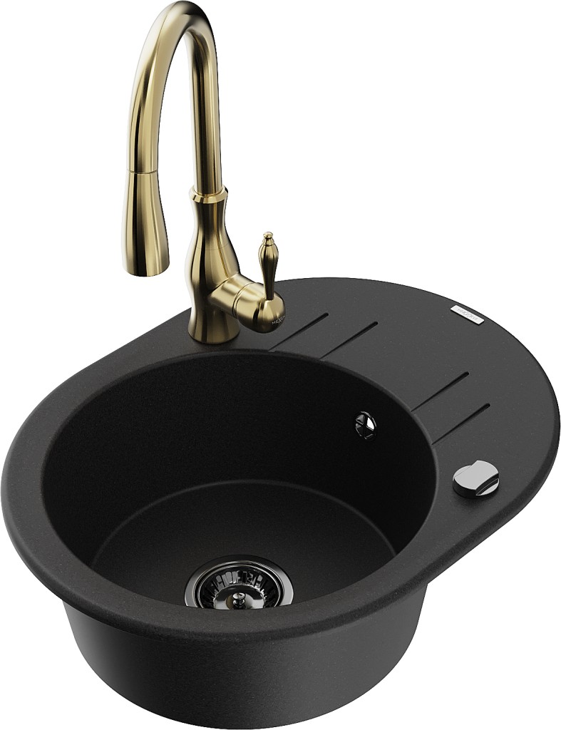 Technické dáta: drez: Rozmer: 586 x 458 x 190 mm Hĺbka komory: 180 mm Rozmery komory: 378x374 mm Priemer odtoku: ø90 mm Typ: 1-miska s krátkym odkvapkávačom Typ: Zapustené do pracovnej dosky Čierna farba Povrchová úprava sifónu: čierna Materiál: žula (80% žulové kamenivo, 20% živice) Prepadový otvor: Áno Otvory: (batérie, automatické) 2 Inštalácia: Univerzálna, je možné inštalovať s odkvapkávačom na ľavú alebo pravú stranu Vysoká odolnosť proti poškriabaniu a zmene farby Odolnosť proti tepelným šokom Ľahko čistiteľný povrch Dva dodatočné vyfrézované otvory na samodierovanie ø35 kuchynská batéria: Materiál: mosadz Farba: Zlatá Hlava: Keramická Prevzdušňovač: Áno Typ: Jedna páka Výška batérie: 410 mm Rozsah výtoku: 231 mm(GT) Ean: 5905315037015