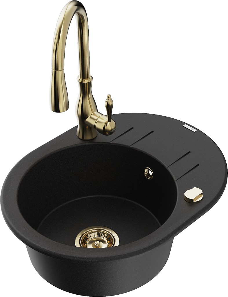 Technické dáta: drez: Rozmer: 586 x 458 x 190 mm Hĺbka komory: 180 mm Rozmery komory: 378x374 mm Priemer odtoku: ø90 mm Typ: 1-miska s krátkym odkvapkávačom Typ: Zapustené do pracovnej dosky Čierna farba Povrchová úprava sifónu: zlatá Materiál: žula (80% žulové kamenivo, 20% živice) Prepadový otvor: Áno Otvory: (batérie, automatické) 2 Inštalácia: Univerzálna, je možné inštalovať s odkvapkávačom na ľavú alebo pravú stranu Vysoká odolnosť proti poškriabaniu a zmene farby Odolnosť proti tepelným šokom Ľahko čistiteľný povrch Dva dodatočné vyfrézované otvory na samodierovanie ø35 kuchynská batéria: Materiál: mosadz Farba: Zlatá Hlava: Keramická Prevzdušňovač: Áno Typ: Jedna páka Výška batérie: 410 mm Rozsah výtoku: 231 mm(GT) Ean: 5905315037008