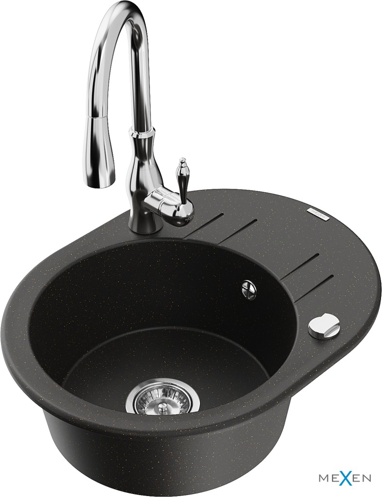 Technické dáta: drez: Rozmer: 586 x 458 x 190 mm Hĺbka komory: 180 mm Rozmery komory: 378x374 mm Priemer odtoku: ø90 mm Typ: 1-miska s krátkym odkvapkávačom Typ: Zapustené do pracovnej dosky Farba: čierna / zlatá metalíza Povrchová úprava sifónu: Chrome Materiál: žula (80% žulové kamenivo, 20% živice) Prepadový otvor: Áno Otvory: (batérie, automatické) 2 Inštalácia: Univerzálna, je možné inštalovať s odkvapkávačom na ľavú alebo pravú stranu Vysoká odolnosť proti poškriabaniu a zmene farby Odolnosť proti tepelným šokom Ľahko čistiteľný povrch Dva dodatočné vyfrézované otvory na samodierovanie ø35 kuchynská batéria: Materiál: mosadz Farba: Chrome Hlava: Keramická Prevzdušňovač: Áno Typ: Jedna páka Výška batérie: 410 mm Rozsah výtoku: 231 mm(GT) Ean: 5905315036896