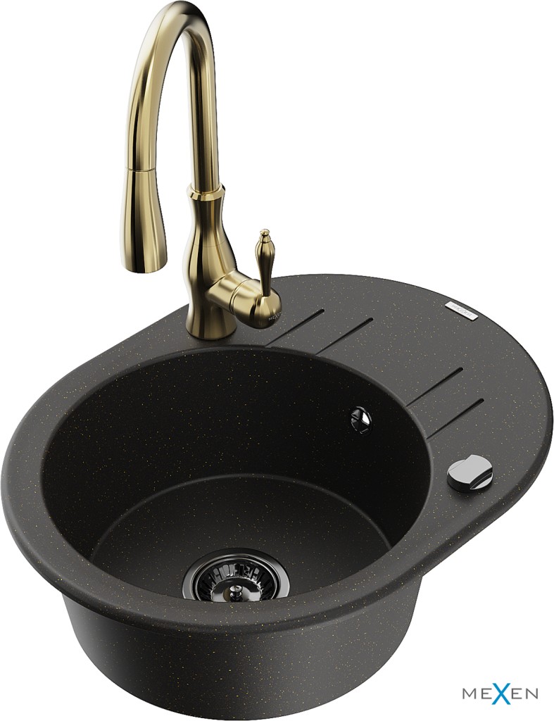 Technické dáta: drez: Rozmer: 586 x 458 x 190 mm Hĺbka komory: 180 mm Rozmery komory: 378x374 mm Priemer odtoku: ø90 mm Typ: 1-miska s krátkym odkvapkávačom Typ: Zapustené do pracovnej dosky Farba: čierna / zlatá metalíza Povrchová úprava sifónu: čierna Materiál: žula (80% žulové kamenivo, 20% živice) Prepadový otvor: Áno Otvory: (batérie, automatické) 2 Inštalácia: Univerzálna, je možné inštalovať s odkvapkávačom na ľavú alebo pravú stranu Vysoká odolnosť proti poškriabaniu a zmene farby Odolnosť proti tepelným šokom Ľahko čistiteľný povrch Dva dodatočné vyfrézované otvory na samodierovanie ø35 kuchynská batéria: Materiál: mosadz Farba: Zlatá Hlava: Keramická Prevzdušňovač: Áno Typ: Jedna páka Výška batérie: 410 mm Rozsah výtoku: 231 mm(GT) Ean: 5905315036919