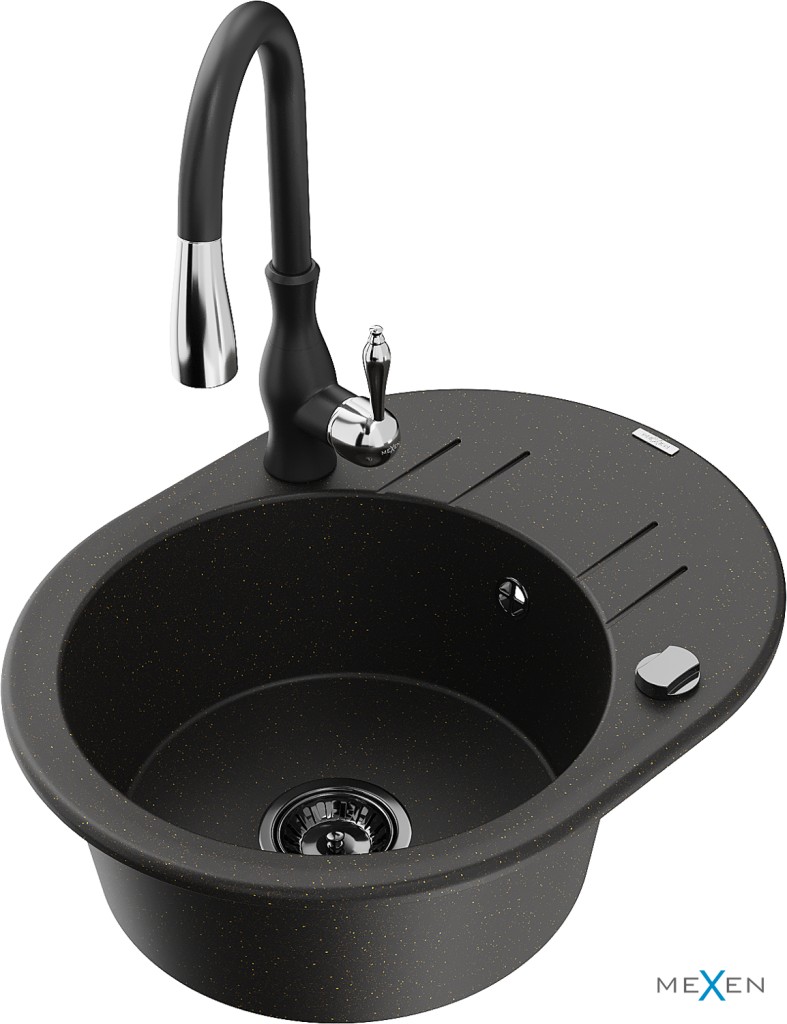 Technické dáta: drez: Rozmer: 586 x 458 x 190 mm Hĺbka komory: 180 mm Rozmery komory: 378x374 mm Priemer odtoku: ø90 mm Typ: 1-miska s krátkym odkvapkávačom Typ: Zapustené do pracovnej dosky Farba: čierna / zlatá metalíza Povrchová úprava sifónu: čierna Materiál: žula (80% žulové kamenivo, 20% živice) Prepadový otvor: Áno Otvory: (batérie, automatické) 2 Inštalácia: Univerzálna, je možné inštalovať s odkvapkávačom na ľavú alebo pravú stranu Vysoká odolnosť proti poškriabaniu a zmene farby Odolnosť proti tepelným šokom Ľahko čistiteľný povrch Dva dodatočné vyfrézované otvory na samodierovanie ø35 kuchynská batéria: Materiál: mosadz Čierna farba Hlava: Keramická Prevzdušňovač: Áno Typ: Jedna páka Výška batérie: 410 mm Rozsah výtoku: 231 mm(GT) Ean: 5905315036933