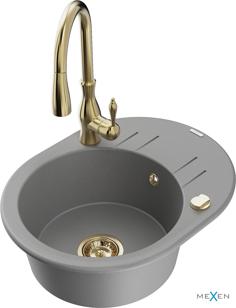 Technické dáta: drez: Rozmer: 586 x 458 x 190 mm Hĺbka komory: 180 mm Rozmery komory: 378x374 mm Priemer odtoku: ø90 mm Typ: 1-miska s krátkym odkvapkávačom Typ: Zapustené do pracovnej dosky Šedá farba Povrchová úprava sifónu: zlatá Materiál: žula (80% žulové kamenivo, 20% živice) Prepadový otvor: Áno Otvory: (batérie, automatické) 2 Inštalácia: Univerzálna, je možné inštalovať s odkvapkávačom na ľavú alebo pravú stranu Vysoká odolnosť proti poškriabaniu a zmene farby Odolnosť proti tepelným šokom Ľahko čistiteľný povrch Dva dodatočné vyfrézované otvory na samodierovanie ø35 kuchynská batéria: Materiál: mosadz Farba: Zlatá Hlava: Keramická Prevzdušňovač: Áno Typ: Jedna páka Výška batérie: 410 mm Rozsah výtoku: 231 mm(GT) Ean: 5905315036810