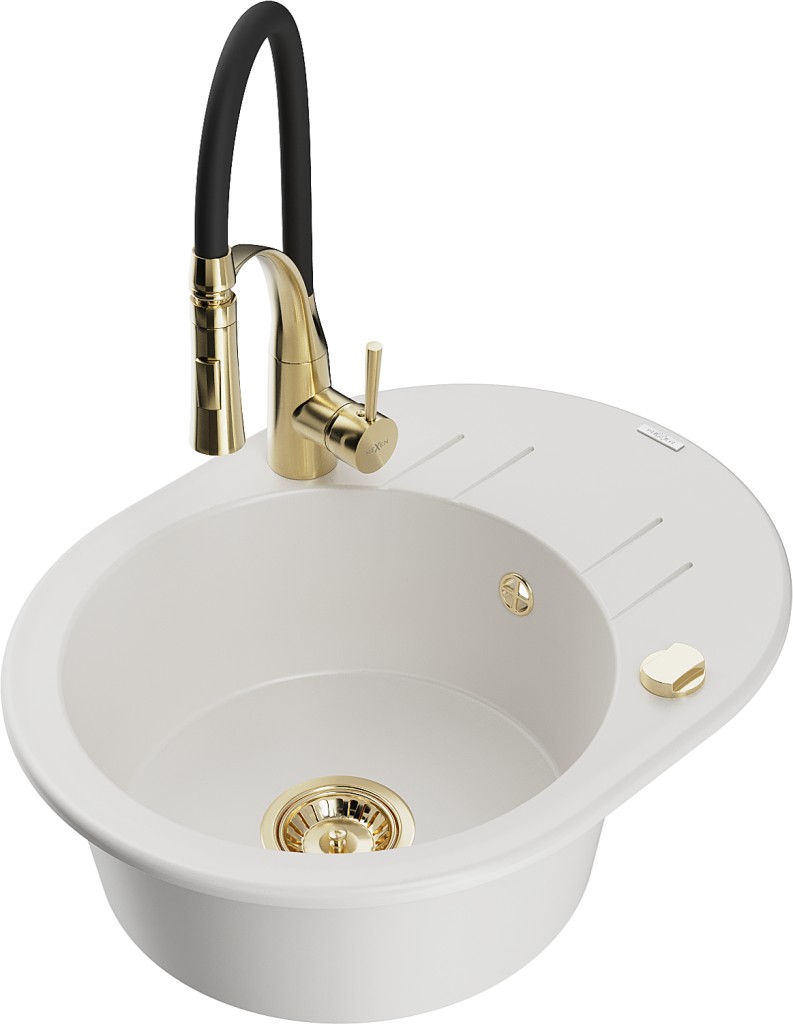 Technické dáta: drez: Rozmer: 586 x 458 x 190 mm Hĺbka komory: 180 mm Šírka komory: 378x374 mm Priemer odtoku: ø90 mm Typ: 1-miska s krátkym odkvapkávačom Typ: Zapustené do pracovnej dosky biela farba Povrchová úprava sifónu: zlatá Materiál: žula (80% žulové kamenivo, 20% živice) Prepadový otvor: Áno Otvory: (batérie, automatické) 2 Inštalácia: Univerzálna, je možné inštalovať s odkvapkávačom na ľavú alebo pravú stranu Vysoká odolnosť proti poškriabaniu a zmene farby Odolnosť proti tepelným šokom Ľahko čistiteľný povrch Dva dodatočné vyfrézované otvory na samodierovanie ø35 kuchynská batéria: Materiál: mosadz Farba: Zlatá/Čierna Hlava: Keramická Prevzdušňovač: Áno Typ hubica: Flexibilný s mosadzným držiakom Typ: Jedna páka Výška batérie: 430 mm Rozsah výtoku: 235 mm(GT) Ean: 5905315048424