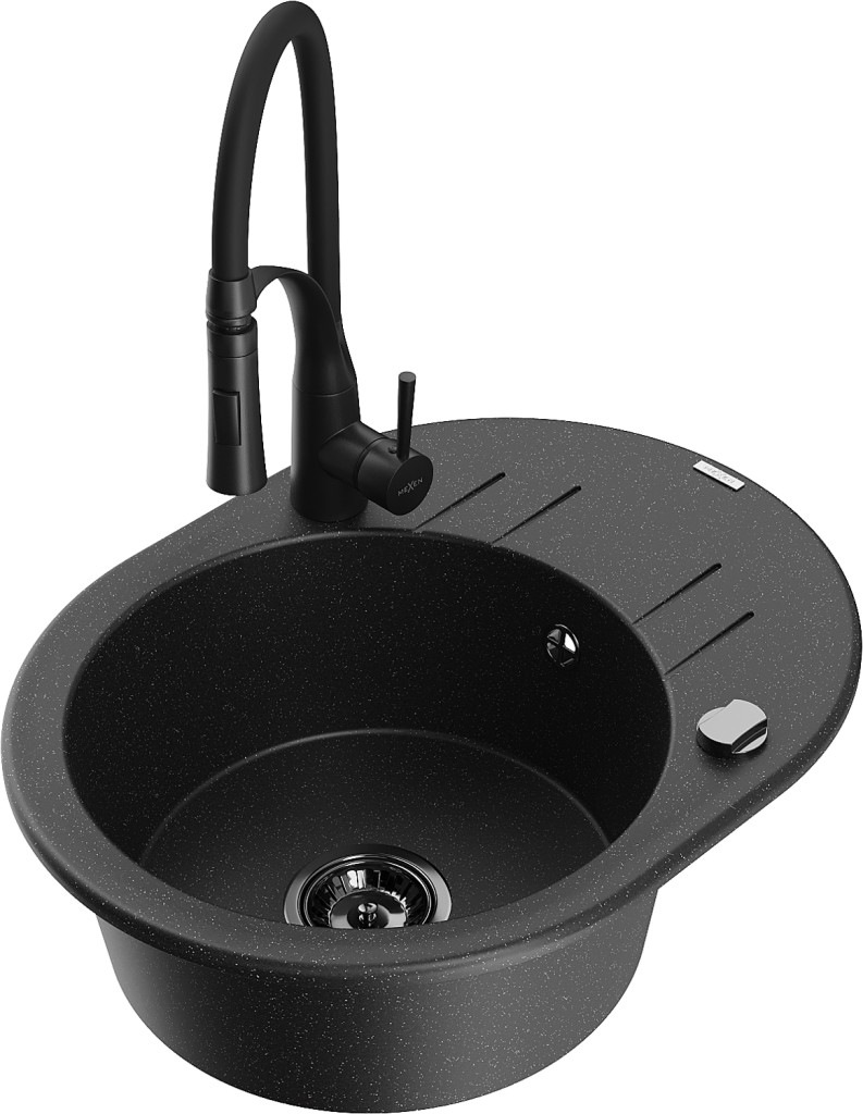 Technické dáta: drez: Rozmer: 586 x 458 x 190 mm Hĺbka komory: 180 mm Šírka komory: 378x374 mm Priemer odtoku: ø90 mm Typ: 1-miska s krátkym odkvapkávačom Typ: Zapustené do pracovnej dosky Farba: čierna/strieborná metalíza Povrchová úprava sifónu: čierna Materiál: žula (80% žulové kamenivo, 20% živice) Prepadový otvor: Áno Otvory: (batérie, automatické) 2 Inštalácia: Univerzálna, je možné inštalovať s odkvapkávačom na ľavú alebo pravú stranu Vysoká odolnosť proti poškriabaniu a zmene farby Odolnosť proti tepelným šokom Ľahko čistiteľný povrch Dva dodatočné vyfrézované otvory na samodierovanie ø35 kuchynská batéria: Materiál: mosadz Čierna farba Hlava: Keramická Prevzdušňovač: Áno Typ hubica: Flexibilný s mosadzným držiakom Typ: Jedna páka Výška batérie: 430 mm Rozsah výtoku: 235 mm(GT) Ean: 5905315048622