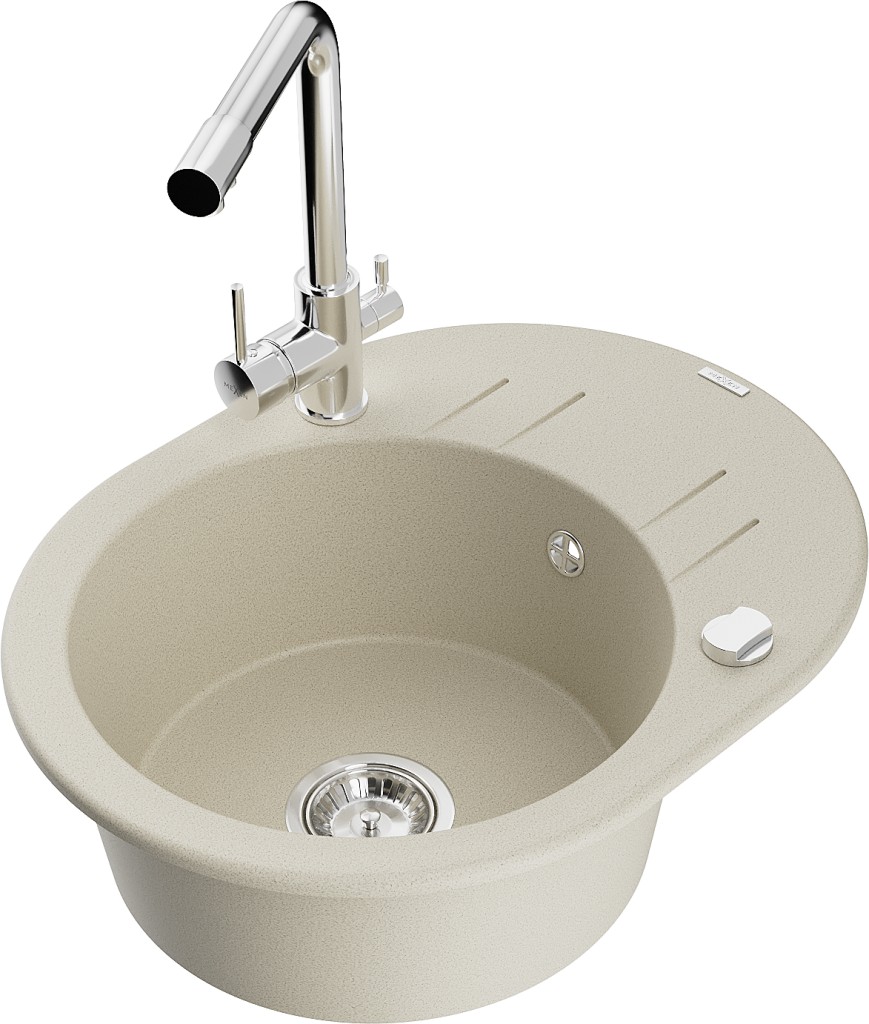 Technické dáta: drez: Rozmer: 586 x 458 x 190 mm Hĺbka komory: 180 mm Šírka komory: 378x374 mm Priemer odtoku: ø90 mm Typ: 1-miska s krátkym odkvapkávačom Typ: Zapustené do pracovnej dosky Farba béžová Povrchová úprava sifónu: Chrome Materiál: žula (80% žulové kamenivo, 20% živice) Prepadový otvor: Áno Otvory: (batérie, automatické) 2 Inštalácia: Univerzálna, je možné inštalovať s odkvapkávačom na ľavú alebo pravú stranu Vysoká odolnosť proti poškriabaniu a zmene farby Odolnosť proti tepelným šokom Ľahko čistiteľný povrch Dva dodatočné vyfrézované otvory na samodierovanie ø35 kuchynská batéria: Materiál: mosadz Farba: Chrome Hlava: Keramická Prevzdušňovač: Áno Typ: Dve rukoväte Rozsah výtoku: 235 mm Výška batérie: 315 mm Dvojhlavá batéria s prídavným kanálom pre filtrovanú pitnú vodu(GT) Ean: 5905315026538