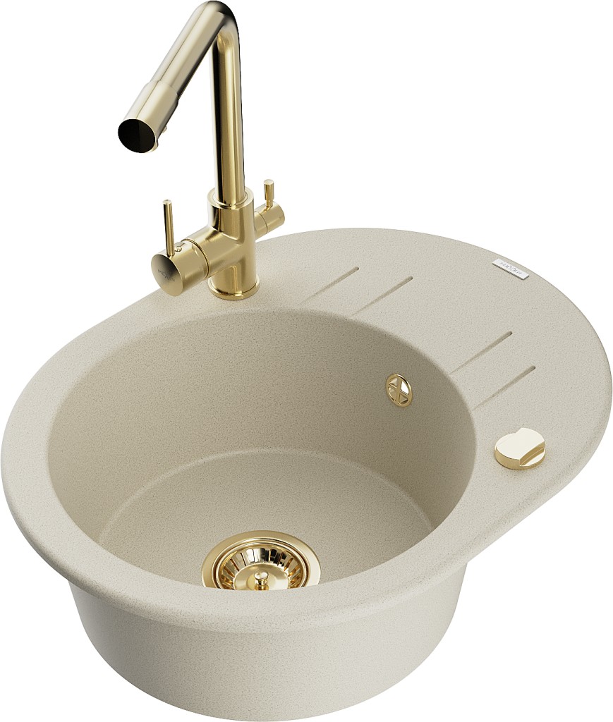 Technické dáta: drez: Rozmer: 586 x 458 x 190 mm Hĺbka komory: 180 mm Šírka komory: 378x374 mm Priemer odtoku: ø90 mm Typ: 1-miska s krátkym odkvapkávačom Typ: Zapustené do pracovnej dosky Farba béžová Povrchová úprava sifónu: zlatá Materiál: žula (80% žulové kamenivo, 20% živice) Prepadový otvor: Áno Otvory: (batérie, automatické) 2 Inštalácia: Univerzálna, je možné inštalovať s odkvapkávačom na ľavú alebo pravú stranu Vysoká odolnosť proti poškriabaniu a zmene farby Odolnosť proti tepelným šokom Ľahko čistiteľný povrch Dva dodatočné vyfrézované otvory na samodierovanie ø35 kuchynská batéria: Materiál: mosadz Farba: Zlatá Hlava: Keramická Prevzdušňovač: Áno Typ: Dve rukoväte Rozsah výtoku: 235 mm Výška batérie: 315 mm Dvojhlavá batéria s prídavným kanálom pre filtrovanú pitnú vodu(GT) Ean: 5905315026552
