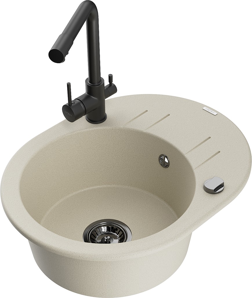 Technické dáta: drez: Rozmer: 586 x 458 x 190 mm Hĺbka komory: 180 mm Šírka komory: 378x374 mm Priemer odtoku: ø90 mm Typ: 1-miska s krátkym odkvapkávačom Typ: Zapustené do pracovnej dosky Farba béžová Povrchová úprava sifónu: čierna Materiál: žula (80% žulové kamenivo, 20% živice) Prepadový otvor: Áno Otvory: (batérie, automatické) 2 Inštalácia: Univerzálna, je možné inštalovať s odkvapkávačom na ľavú alebo pravú stranu Vysoká odolnosť proti poškriabaniu a zmene farby Odolnosť proti tepelným šokom Ľahko čistiteľný povrch Dva dodatočné vyfrézované otvory na samodierovanie ø35 kuchynská batéria: Materiál: mosadz Čierna farba Hlava: Keramická Prevzdušňovač: Áno Typ: Dve rukoväte Rozsah výtoku: 235 mm Výška batérie: 315 mm Dvojhlavá batéria s prídavným kanálom pre filtrovanú pitnú vodu(GT) Ean: 5905315026569