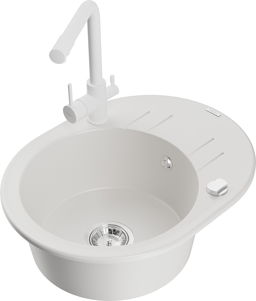 Technické dáta: drez: Rozmer: 586 x 458 x 190 mm Hĺbka komory: 180 mm Šírka komory: 378x374 mm Priemer odtoku: ø90 mm Typ: 1-miska s krátkym odkvapkávačom Typ: Zapustené do pracovnej dosky biela farba Povrchová úprava sifónu: Chrome Materiál: žula (80% žulové kamenivo, 20% živice) Prepadový otvor: Áno Otvory: (batérie, automatické) 2 Inštalácia: Univerzálna, je možné inštalovať s odkvapkávačom na ľavú alebo pravú stranu Vysoká odolnosť proti poškriabaniu a zmene farby Odolnosť proti tepelným šokom Ľahko čistiteľný povrch Dva dodatočné vyfrézované otvory na samodierovanie ø35 kuchynská batéria: Materiál: mosadz biela farba Hlava: Keramická Prevzdušňovač: Áno Typ: Dve rukoväte Rozsah výtoku: 235 mm Výška batérie: 315 mm Dvojhlavá batéria s prídavným kanálom pre filtrovanú pitnú vodu(GT) Ean: 5905315026507