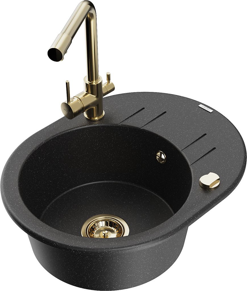 Technické dáta: drez: Rozmer: 586 x 458 x 190 mm Hĺbka komory: 180 mm Šírka komory: 378x374 mm Priemer odtoku: ø90 mm Typ: 1-miska s krátkym odkvapkávačom Typ: Zapustené do pracovnej dosky Farba: čierna/strieborná metalíza Povrchová úprava sifónu: zlatá Materiál: žula (80% žulové kamenivo, 20% živice) Prepadový otvor: Áno Otvory: (batérie, automatické) 2 Inštalácia: Univerzálna, je možné inštalovať s odkvapkávačom na ľavú alebo pravú stranu Vysoká odolnosť proti poškriabaniu a zmene farby Odolnosť proti tepelným šokom Ľahko čistiteľný povrch Dva dodatočné vyfrézované otvory na samodierovanie ø35 kuchynská batéria: Materiál: mosadz Farba: Zlatá Hlava: Keramická Prevzdušňovač: Áno Typ: Dve rukoväte Rozsah výtoku: 235 mm Výška batérie: 315 mm Dvojhlavá batéria s prídavným kanálom pre filtrovanú pitnú vodu(GT) Ean: 5905315026637