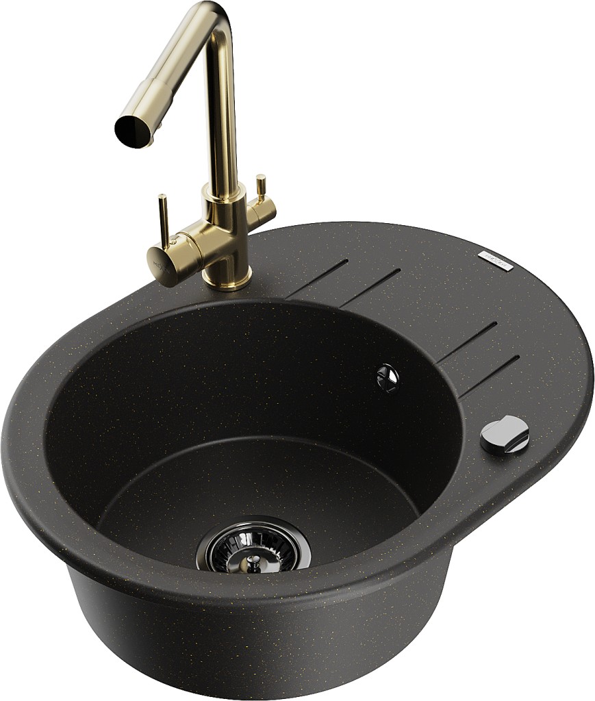 Technické dáta: drez: Rozmer: 586 x 458 x 190 mm Hĺbka komory: 180 mm Šírka komory: 378x374 mm Priemer odtoku: ø90 mm Typ: 1-miska s krátkym odkvapkávačom Typ: Zapustené do pracovnej dosky Farba: čierna / zlatá metalíza Povrchová úprava sifónu: čierna Materiál: žula (80% žulové kamenivo, 20% živice) Prepadový otvor: Áno Otvory: (batérie, automatické) 2 Inštalácia: Univerzálna, je možné inštalovať s odkvapkávačom na ľavú alebo pravú stranu Vysoká odolnosť proti poškriabaniu a zmene farby Odolnosť proti tepelným šokom Ľahko čistiteľný povrch Dva dodatočné vyfrézované otvory na samodierovanie ø35 kuchynská batéria: Materiál: mosadz Farba: Zlatá Hlava: Keramická Prevzdušňovač: Áno Typ: Dve rukoväte Rozsah výtoku: 235 mm Výška batérie: 315 mm Dvojhlavá batéria s prídavným kanálom pre filtrovanú pitnú vodu(GT) Ean: 5905315026682