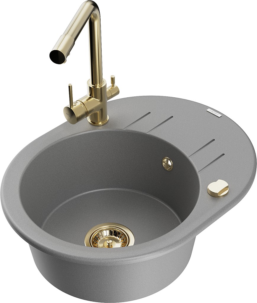 Technické dáta: drez: Rozmer: 586 x 458 x 190 mm Hĺbka komory: 180 mm Šírka komory: 378x374 mm Priemer odtoku: ø90 mm Typ: 1-miska s krátkym odkvapkávačom Typ: Zapustené do pracovnej dosky Šedá farba Povrchová úprava sifónu: zlatá Materiál: žula (80% žulové kamenivo, 20% živice) Prepadový otvor: Áno Otvory: (batérie, automatické) 2 Inštalácia: Univerzálna, je možné inštalovať s odkvapkávačom na ľavú alebo pravú stranu Vysoká odolnosť proti poškriabaniu a zmene farby Odolnosť proti tepelným šokom Ľahko čistiteľný povrch Dva dodatočné vyfrézované otvory na samodierovanie ø35 kuchynská batéria: Materiál: mosadz Farba: Zlatá Hlava: Keramická Prevzdušňovač: Áno Typ: Dve rukoväte Rozsah výtoku: 235 mm Výška batérie: 315 mm Dvojhlavá batéria s prídavným kanálom pre filtrovanú pitnú vodu(GT) Ean: 5905315026583