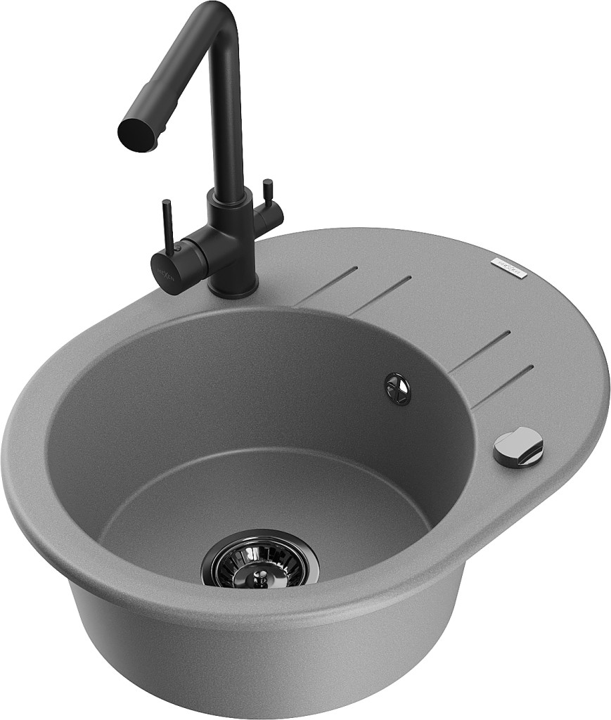Technické dáta: drez: Rozmer: 586 x 458 x 190 mm Hĺbka komory: 180 mm Šírka komory: 378x374 mm Priemer odtoku: ø90 mm Typ: 1-miska s krátkym odkvapkávačom Typ: Zapustené do pracovnej dosky Šedá farba Povrchová úprava sifónu: čierna Materiál: žula (80% žulové kamenivo, 20% živice) Prepadový otvor: Áno Otvory: (batérie, automatické) 2 Inštalácia: Univerzálna, je možné inštalovať s odkvapkávačom na ľavú alebo pravú stranu Vysoká odolnosť proti poškriabaniu a zmene farby Odolnosť proti tepelným šokom Ľahko čistiteľný povrch Dva dodatočné vyfrézované otvory na samodierovanie ø35 kuchynská batéria: Materiál: mosadz Čierna farba Hlava: Keramická Prevzdušňovač: Áno Typ: Dve rukoväte Rozsah výtoku: 235 mm Výška batérie: 315 mm Dvojhlavá batéria s prídavným kanálom pre filtrovanú pitnú vodu(GT) Ean: 5905315026606