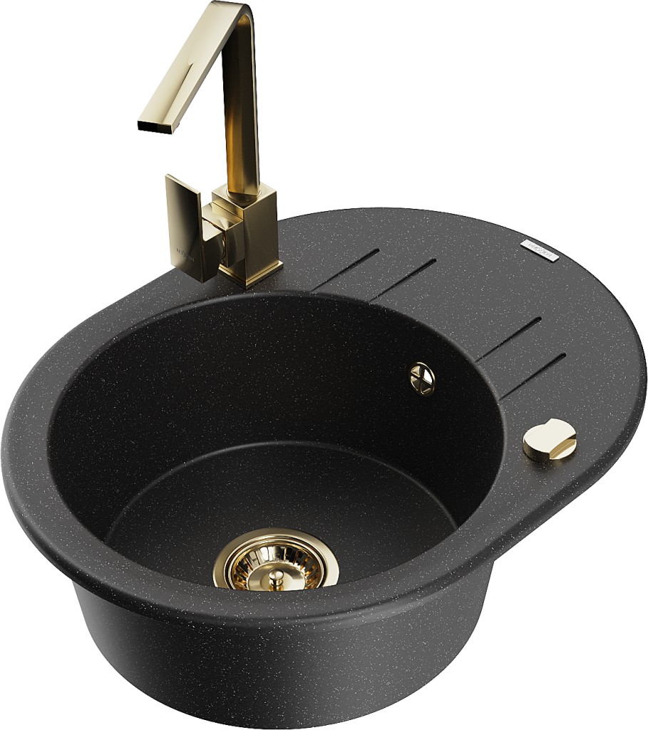 Technické dáta: drez: Rozmer: 586 x 458 x 190 mm Hĺbka komory: 180 mm Šírka komory: 378x374 mm Priemer odtoku: ø90 mm Typ: 1-miska s krátkym odkvapkávačom Typ: Zapustené do pracovnej dosky Farba: čierna/strieborná metalíza Povrchová úprava sifónu: zlatá Materiál: žula (80% žulové kamenivo, 20% živice) Prepadový otvor: Áno Otvory: (batérie, automatické) 2 Inštalácia: Univerzálna, je možné inštalovať s odkvapkávačom na ľavú alebo pravú stranu Vysoká odolnosť proti poškriabaniu a zmene farby Odolnosť proti tepelným šokom Ľahko čistiteľný povrch Jeden dodatočný vyfrézovaný otvor na samodierovanie ø35 kuchynská batéria: Materiál: mosadz Farba: Zlatá Hlava: Keramická Prevzdušňovač: Áno Typ: Jedna páka Výška batérie: 290 mm Rozsah výtoku: 220 mm(GT) Ean: 5905315021519
