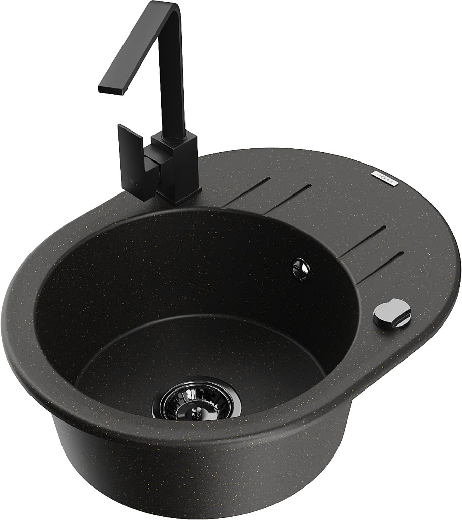 Technické dáta: drez: Rozmer: 586 x 458 x 190 mm Hĺbka komory: 180 mm Šírka komory: 378x374 mm Priemer odtoku: ø90 mm Typ: 1-miska s krátkym odkvapkávačom Typ: Zapustené do pracovnej dosky Farba: čierna / zlatá metalíza Povrchová úprava sifónu: čierna Materiál: žula (80% žulové kamenivo, 20% živice) Prepadový otvor: Áno Otvory: (batérie, automatické) 2 Inštalácia: Univerzálna, je možné inštalovať s odkvapkávačom na ľavú alebo pravú stranu Vysoká odolnosť proti poškriabaniu a zmene farby Odolnosť proti tepelným šokom Ľahko čistiteľný povrch Jeden dodatočný vyfrézovaný otvor na samodierovanie ø35 kuchynská batéria: Materiál: mosadz Čierna farba Hlava: Keramická Prevzdušňovač: Áno Typ: Jedna páka Výška batérie: 290 mm Rozsah výtoku: 220 mm(GT) Ean: 5905315021588