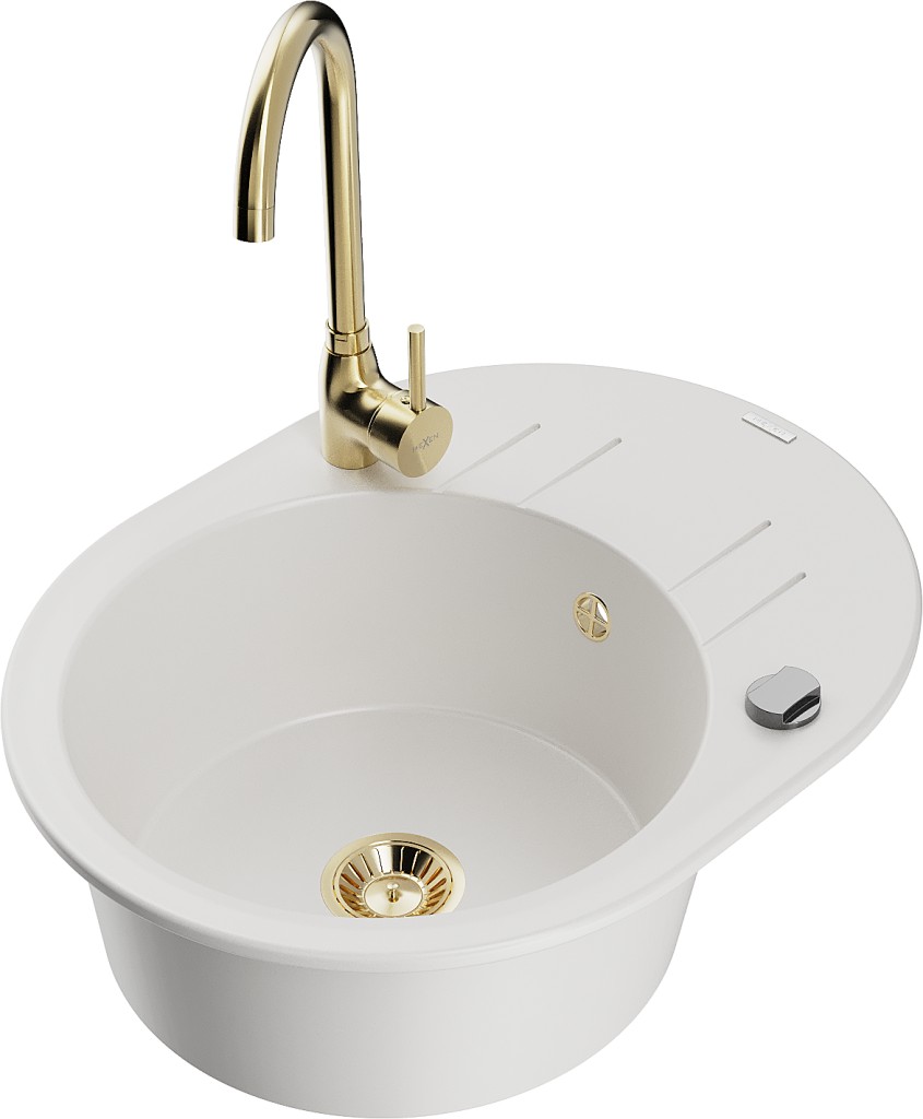 Technické dáta: drez: Rozmer: 586 x 458 x 190 mm Hĺbka komory: 180 mm Šírka komory: 378x374 mm Priemer odtoku: ø90 mm Typ: 1-miska s krátkym odkvapkávačom Typ: Zapustené do pracovnej dosky biela farba Povrchová úprava sifónu: zlatá Materiál: žula (80% žulové kamenivo, 20% živice) Prepadový otvor: Áno Otvory: (batérie, automatické) 2 Inštalácia: Univerzálna, je možné inštalovať s odkvapkávačom na ľavú alebo pravú stranu Vysoká odolnosť proti poškriabaniu a zmene farby Odolnosť proti tepelným šokom Ľahko čistiteľný povrch Jeden dodatočný vyfrézovaný otvor na samodierovanie ø35 kuchynská batéria: Materiál: mosadz Farba: Zlatá Hlava: Keramická Prevzdušňovač: Áno Typ: Jedna páka Výška batérie: 335 mm Rozsah výtoku: 180 mm(GT) Ean: 5905315016270