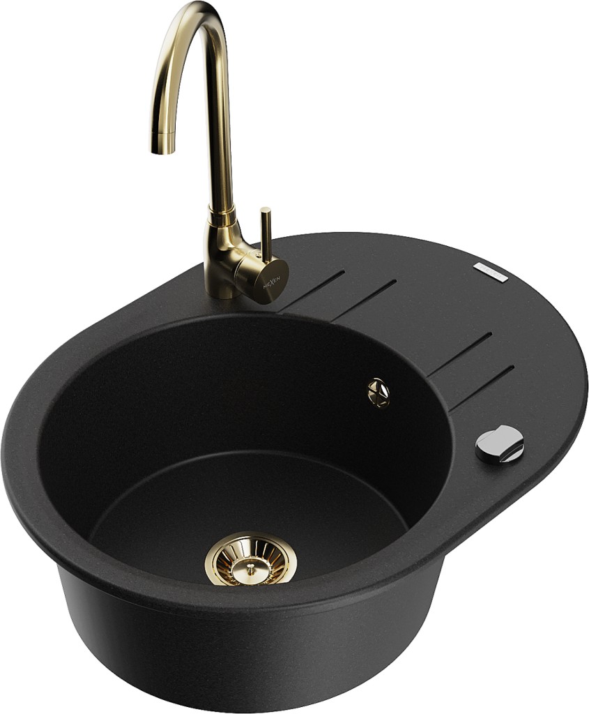 Technické dáta: drez: Rozmer: 586 x 458 x 190 mm Hĺbka komory: 180 mm Šírka komory: 378x374 mm Priemer odtoku: ø90 mm Typ: 1-miska s krátkym odkvapkávačom Typ: Zapustené do pracovnej dosky Čierna farba Povrchová úprava sifónu: zlatá Materiál: žula (80% žulové kamenivo, 20% živice) Prepadový otvor: Áno Otvory: (batérie, automatické) 2 Inštalácia: Univerzálna, je možné inštalovať s odkvapkávačom na ľavú alebo pravú stranu Vysoká odolnosť proti poškriabaniu a zmene farby Odolnosť proti tepelným šokom Ľahko čistiteľný povrch Jeden dodatočný vyfrézovaný otvor na samodierovanie ø35 kuchynská batéria: Materiál: mosadz Farba: Zlatá Hlava: Keramická Prevzdušňovač: Áno Typ: Jedna páka Výška batérie: 335 mm Rozsah výtoku: 180 mm(GT) Ean: 5905315016539