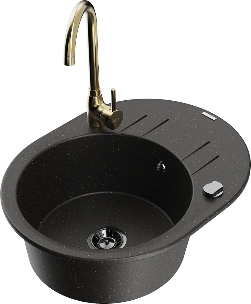 Technické dáta: drez: Rozmer: 586 x 458 x 190 mm Hĺbka komory: 180 mm Šírka komory: 378x374 mm Priemer odtoku: ø90 mm Typ: 1-miska s krátkym odkvapkávačom Typ: Zapustené do pracovnej dosky Farba: čierna / zlatá metalíza Povrchová úprava sifónu: čierna Materiál: žula (80% žulové kamenivo, 20% živice) Prepadový otvor: Áno Otvory: (batérie, automatické) 2 Inštalácia: Univerzálna, je možné inštalovať s odkvapkávačom na ľavú alebo pravú stranu Vysoká odolnosť proti poškriabaniu a zmene farby Odolnosť proti tepelným šokom Ľahko čistiteľný povrch Jeden dodatočný vyfrézovaný otvor na samodierovanie ø35 kuchynská batéria: Materiál: mosadz Farba: Zlatá Hlava: Keramická Prevzdušňovač: Áno Typ: Jedna páka Výška batérie: 335 mm Rozsah výtoku: 180 mm(GT) Ean: 5905315016447